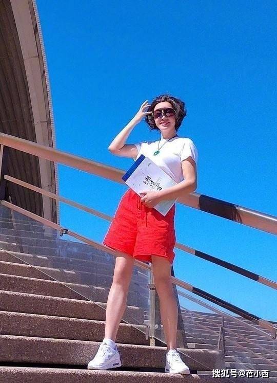 下半身搭配一条亮眼的红色短裤🩳,高饱和度的色彩特别吸睛,提亮了整个搭配。脚上的白色『运动鞋』舒适又减龄,完美契合了整体搭配风格,完全看不出她的真实年龄。