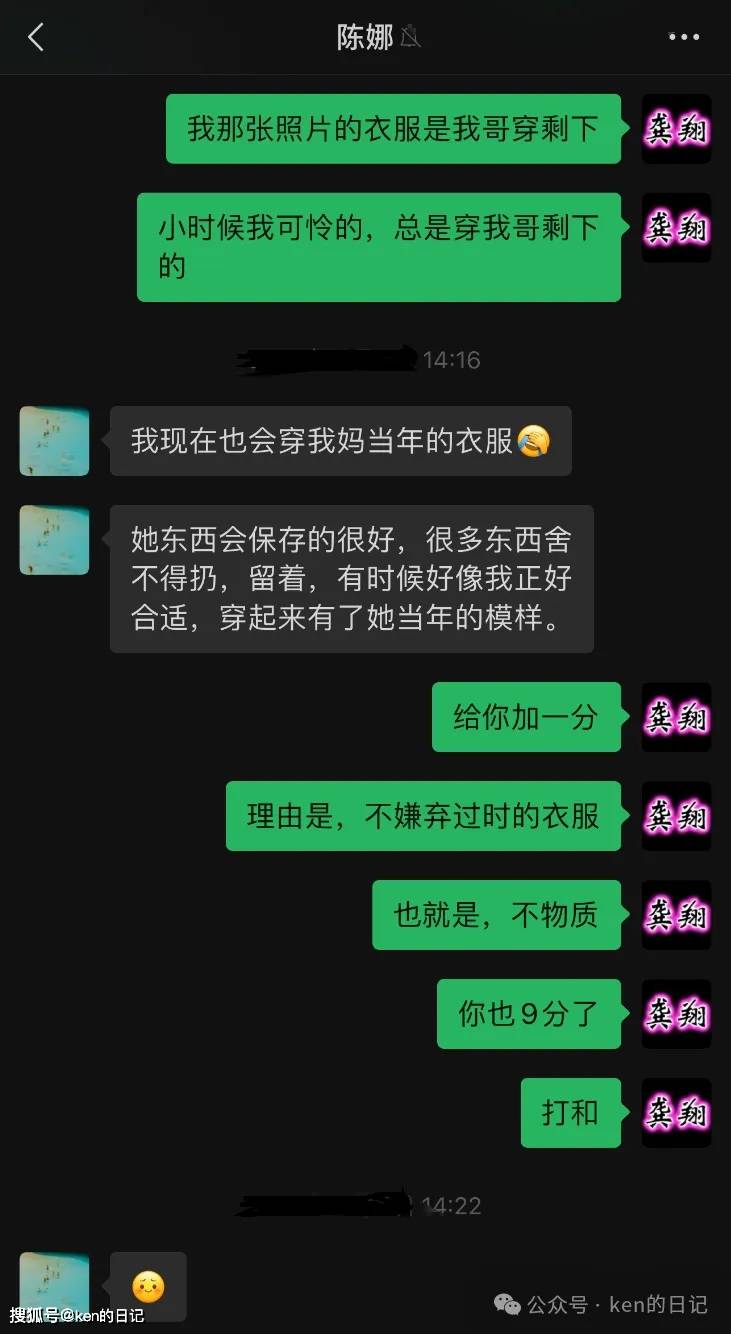 为什么陈娜会突然跟我说她也穿妈妈的旧衣服呢?是因为我发给她的一张我的照片,我穿的那一套衣服是我哥哥穿剩下的,所以我就说我自己小时候可怜,都是穿我哥哥剩下的,为什么会如此呢?