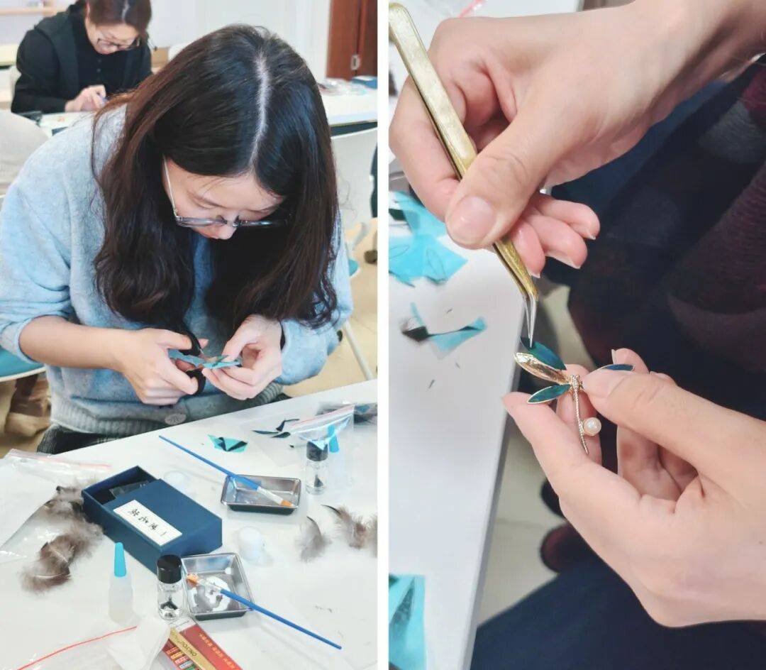 活动现场,三尺讲台上谆谆育人的老师们化身为“非遗匠人”,手持镊子与羽毛,专注地进行刷胶、裁剪、粘贴与定型,将一片片仿点翠羽毛精心镶嵌于胸针金属胎座之上。玉指翻飞间,素净的金属坯体渐次绽放出流光溢彩的东方美学魅力——蝴蝶翩然欲飞,翠竹清雅挺拔,蜻蜓灵动轻盈……每一件胸针都凝聚着创作者的精巧匠心。