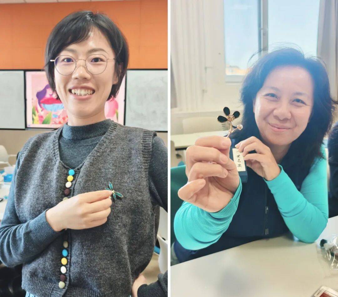 参与活动的老师表示:“一边动手制作,一边感受非遗文化的深厚底蕴,既放松了身心,也收获了一枚漂亮的胸针和满满的成就感。”此次活动将传统文化传承与节日关怀相结合,不仅让大家在忙碌的教学科研工作之余享受了手作乐趣,更在指尖艺术中感悟匠心精神,进一步激发了大家立足岗位、绽放芳华的热情。
