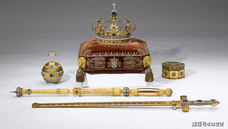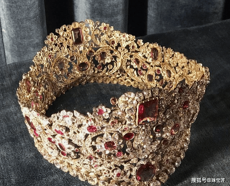 它诞生于巴伐利亚王国如日中天之时,以黄金为底,满镶钻石,红色尖晶石与红宝石错落镶嵌其间,整顶王冠设计宏大、气势磅礴,藤蔓与花卉的纹样层层舒展,仿佛要将巴伐利亚王国的辉煌与荣耀凝固于方寸之间。
