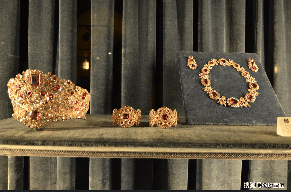 套装包括一顶冠冕、一对手镯、一条项链和一对耳环,以金、银为底座,其上以钻石、红宝石、尖晶石作为点缀,款式繁复奢华,夺目吸睛。
