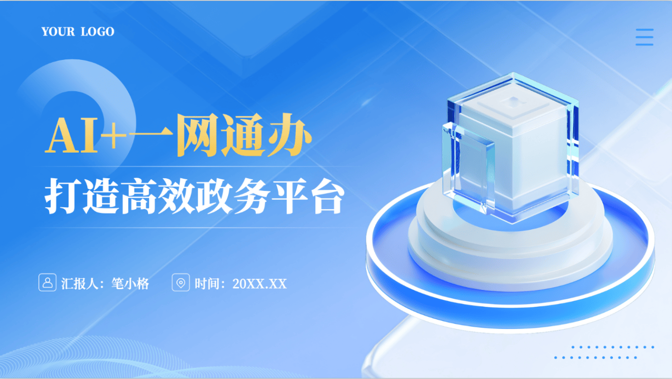 一、科技政务风简约商务风PPT模版这组简约商务风PPT模版,以科技蓝为主色调,搭配3D质感的智能立方体元素,为商务风简约免费PPT模板/PPT分享传递出高效政务的未来感。