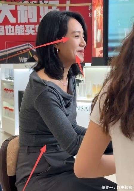 当镜头缓缓推近,时间定格在2026年3月,距离她45岁生日尚有几个月,皮肤的质感、肌肉走向和身形轮廓,都未加修饰地呈现出最真实的一面。她的眼角细纹如扇面般铺展,一笑便聚拢成三道深深的痕迹;法令纹延伸至嘴角,与微张的嘴形交织,呈现出深刻的立体感。最直观的变化则是身形:静坐时,小腹自然隆起,腰部的软组织堆积在一起,连衬衫下摆都被微微顶起;她的背影显得有些宽厚敦实,肩胛骨也略微外扩。这一切都显得那么自然、真实,仿佛在这刻,她的身体与时间无声地对话着。