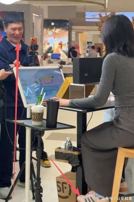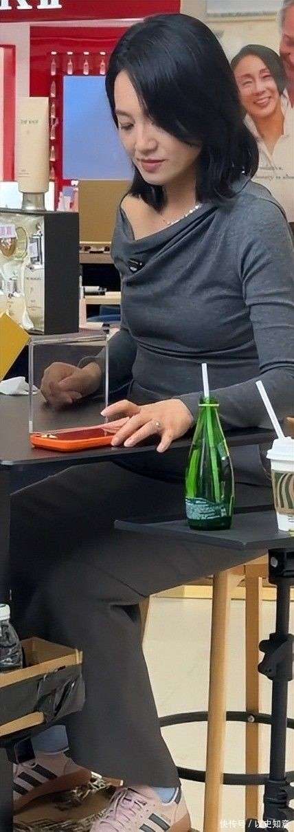 正文 2026年3月7日,万宁王府井免税店的美妆专柜腾出一小块空间,成为朱丹当日的直播现场。这里没有电视台的升降台,没有闪耀的追光灯,也没有高科技的导播设备,只有顾客的脚步声、导购员的叫卖声,和角落里堆积的未拆封的SF快递箱。朱丹坐在一张原木色的折叠凳上,身穿灰调休闲套装,斜襟长袖配同色阔腿裤,脚踩一双粉白撞色的『阿迪达斯』『运动鞋』。发丝自然垂落,未经过烫染处理,只用一根简单的发圈松松束住尾端;她的『妆容』清淡,涂了些润色唇膏💄💄,眉形也只是简单的日常修整。整套『穿搭』毫无刻意的表演痕迹,犹如一位周末在商场随意逛街的都市女性♀️。