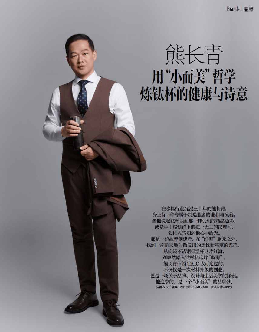 近日,一则消息在水具行业和时尚圈引起关注:TAIC太可品牌总经理熊长青接受了国内知名『时尚杂志』《瑞丽时尚先锋》的专访。这位在水具行业深耕三十年的“老兵”,带着他的钛杯品牌,走进了时尚媒体的视野。这不仅是一次品牌曝光,更是一位制造业企业家对“美”的执着追求的见证。