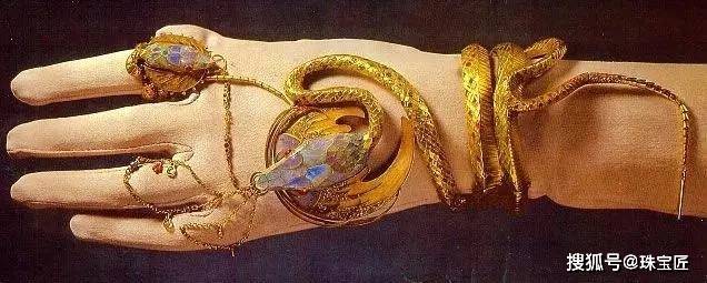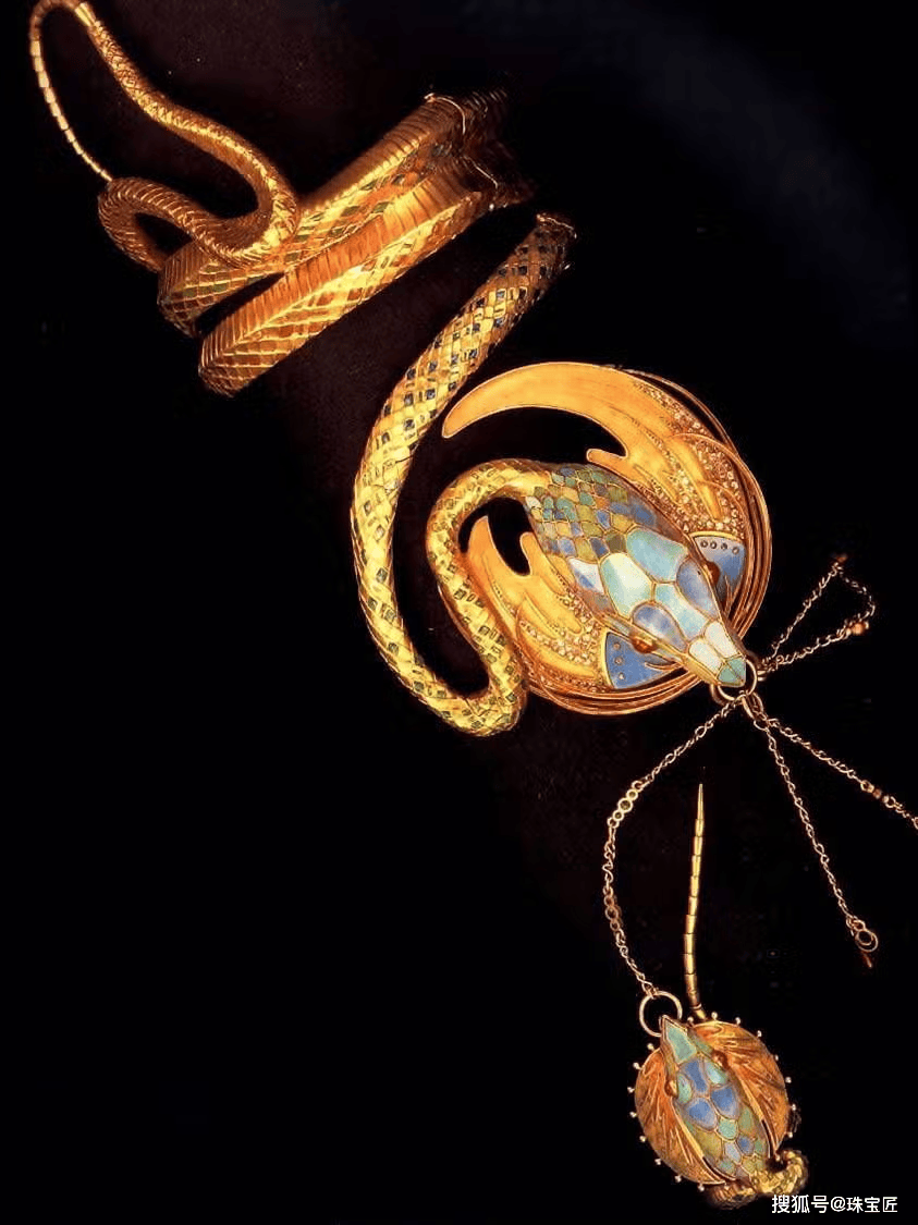 设计既还原了穆夏海报中蛇形首饰的神秘与优雅,又通过精湛的珠宝工艺,让曲线更流畅、佩戴更贴合——黄金的质感与珐琅的温润相互映衬,宛如一条鲜活灵蛇缠绕腕间,兼具戏剧张力与自然诗意。这款手镯不仅成为莎拉・伯恩哈特舞台上的标志性首饰,更成为新艺术珠宝的经典象征。