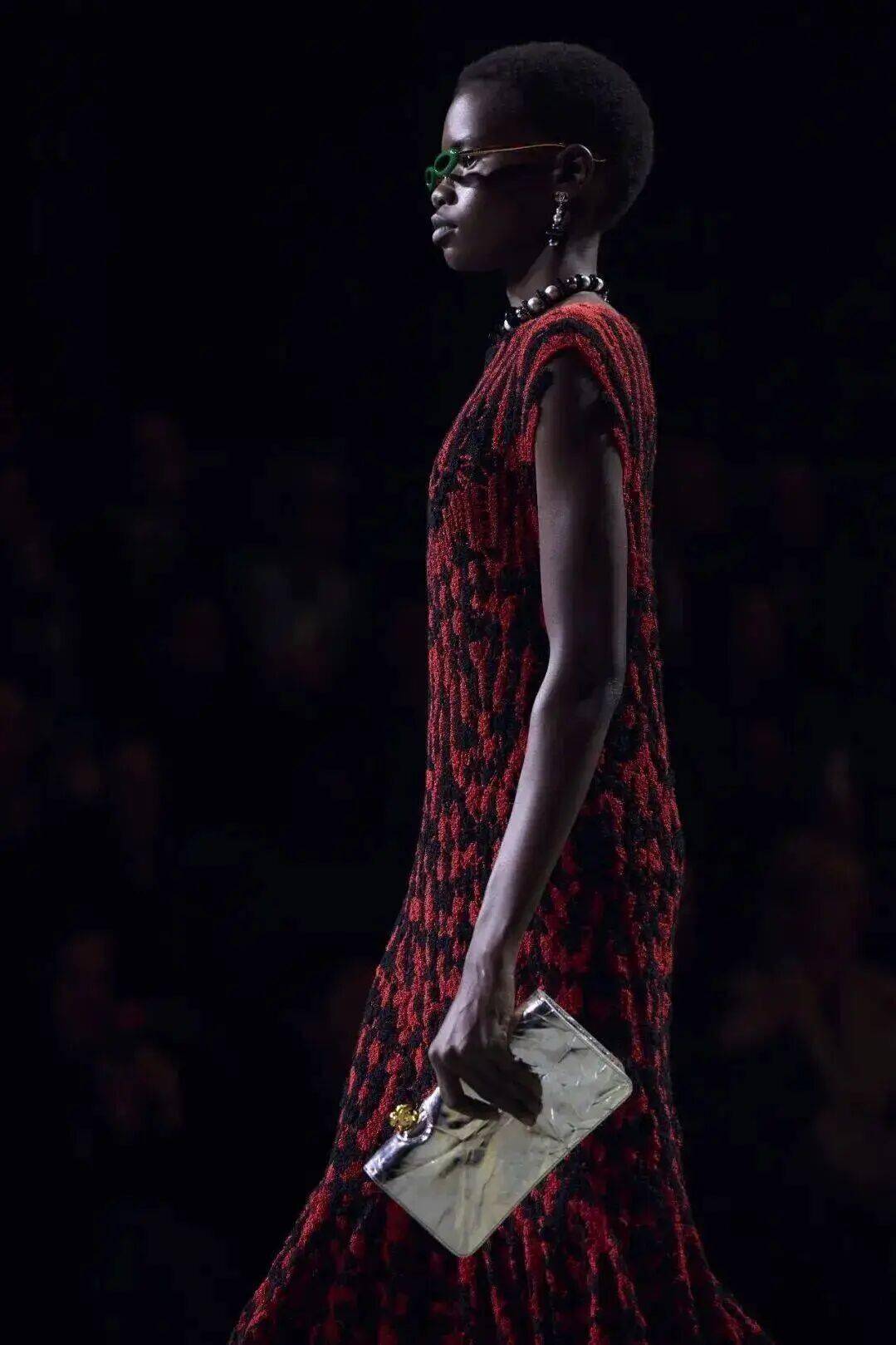 当目光转向夜晚,丝绸的光泽、垂坠的层叠、闪烁的丝绒与错视粗花呢,共同编织出一幅“夜之蝶”的翩然姿态。正如香奈儿女士所言:“时尚既是毛虫,亦是蝴蝶。日间为虫,夜晚化蝶。” Blazy将这一哲学张力贯穿始终——香奈儿既是理性实用的,也是梦幻诱人的。
