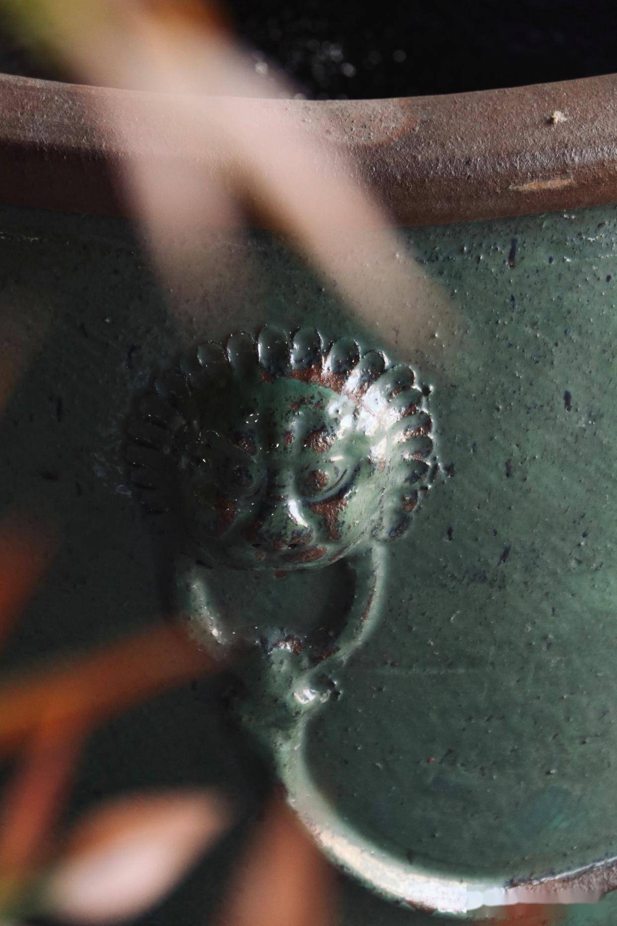 晚清,口径93高61,瓷缸。水缸卷口、平底,上舒下敛,尺寸超大,四面浮雕兽面纹,通体施青釉,釉色肥厚莹润,缸内饰酱釉,品相十分完整,无裂无伤。