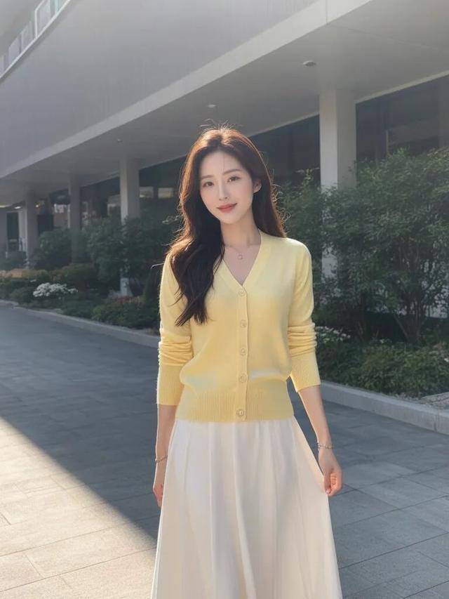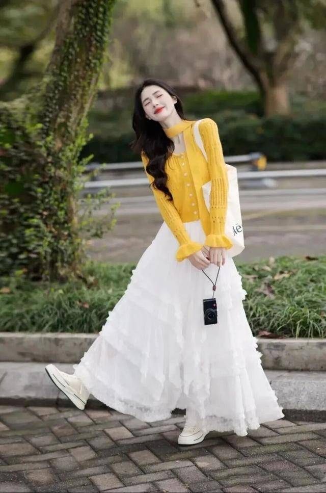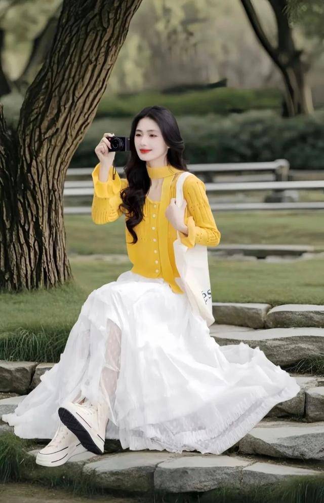 早春这样搭配,清新黄上衣加纯白半裙出游拍照,又美又仙,燃爆你的朋友圈。
