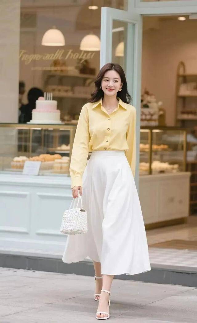 鹅黄的衬衫加上白色的伞裙,这一身非常具有知性味道。拎着个小包包,从咖啡店里走出来的样子,又飒又美。