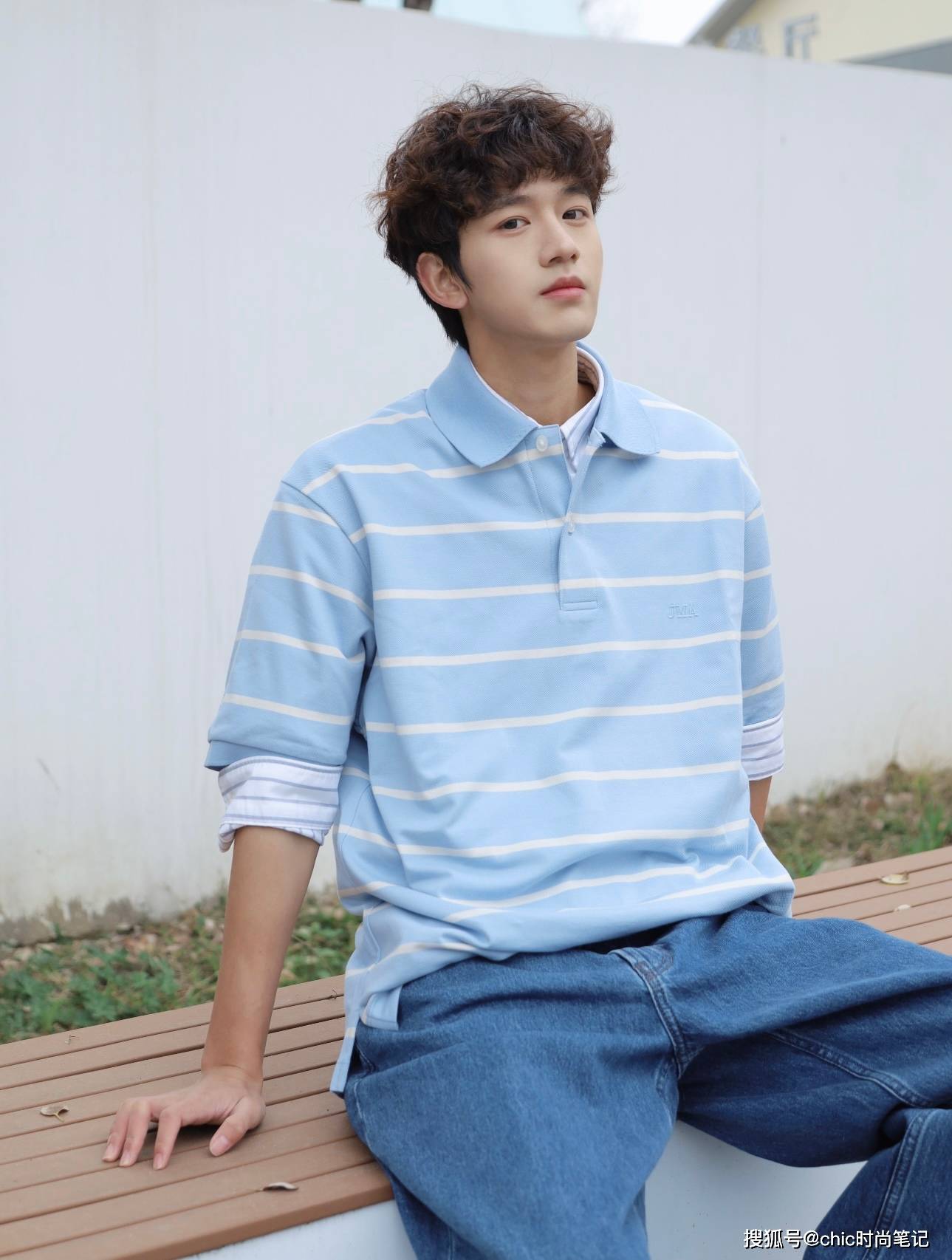 浅蓝色条纹Polo衫叠穿白色衬衫,很干净、治愈的颜色搭配,下身选择蓝色牛仔裤👖,自带清爽与清新,很有男大氛围感噢~