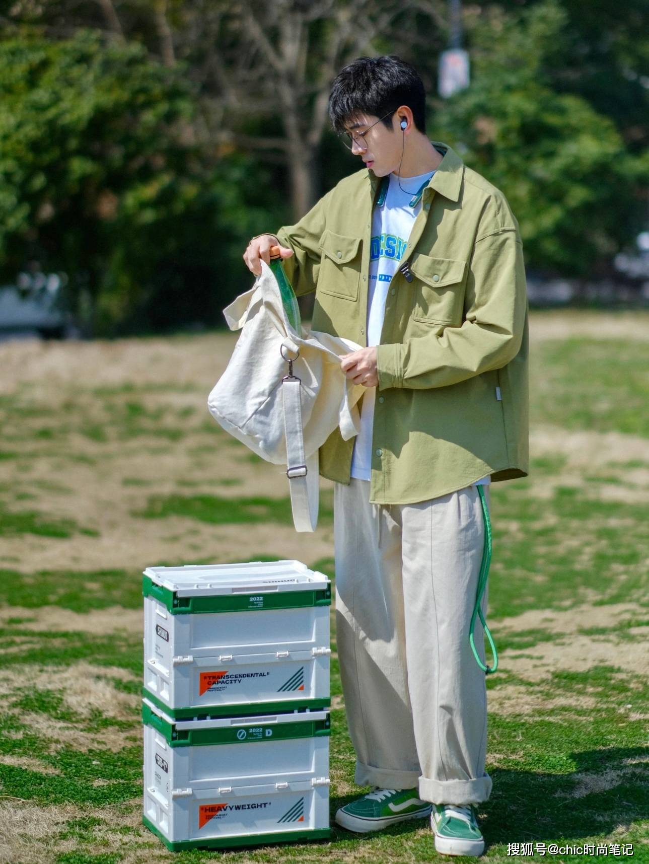 白色宽松字母T恤👕,搭配绿色工装衬衫外套🧥,是大多数男生喜欢的松弛感『穿搭』,下身搭配一条米色工装裤,又休闲又好穿,舒适度满分!