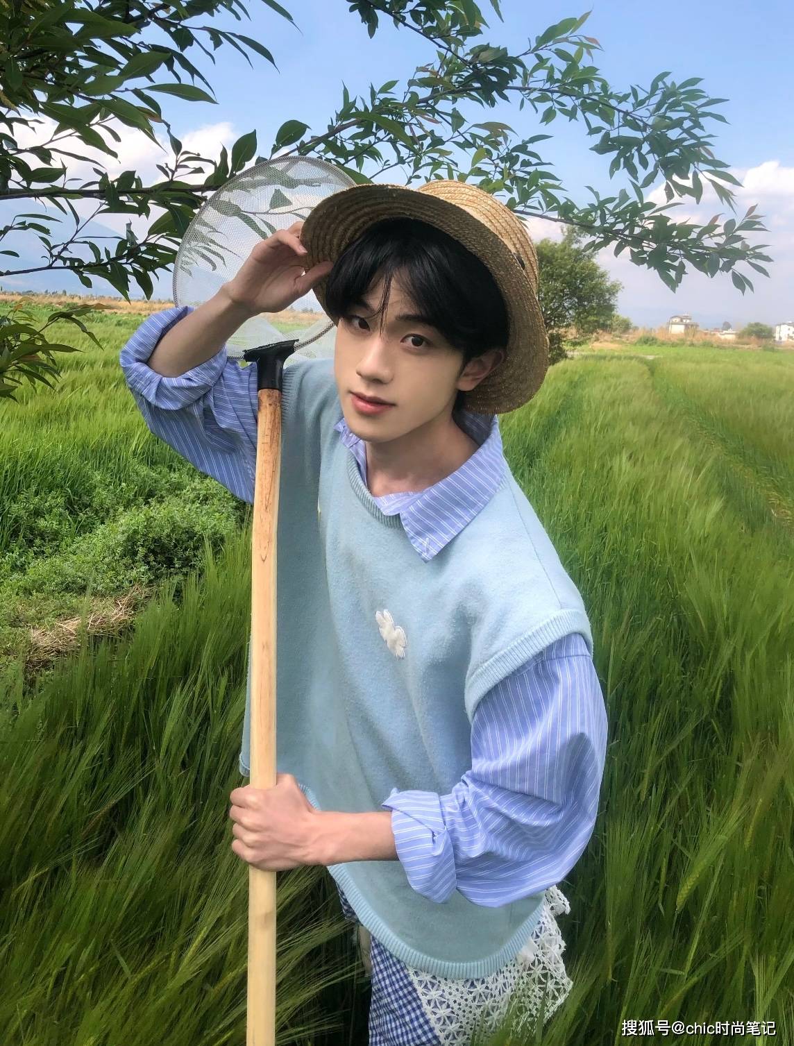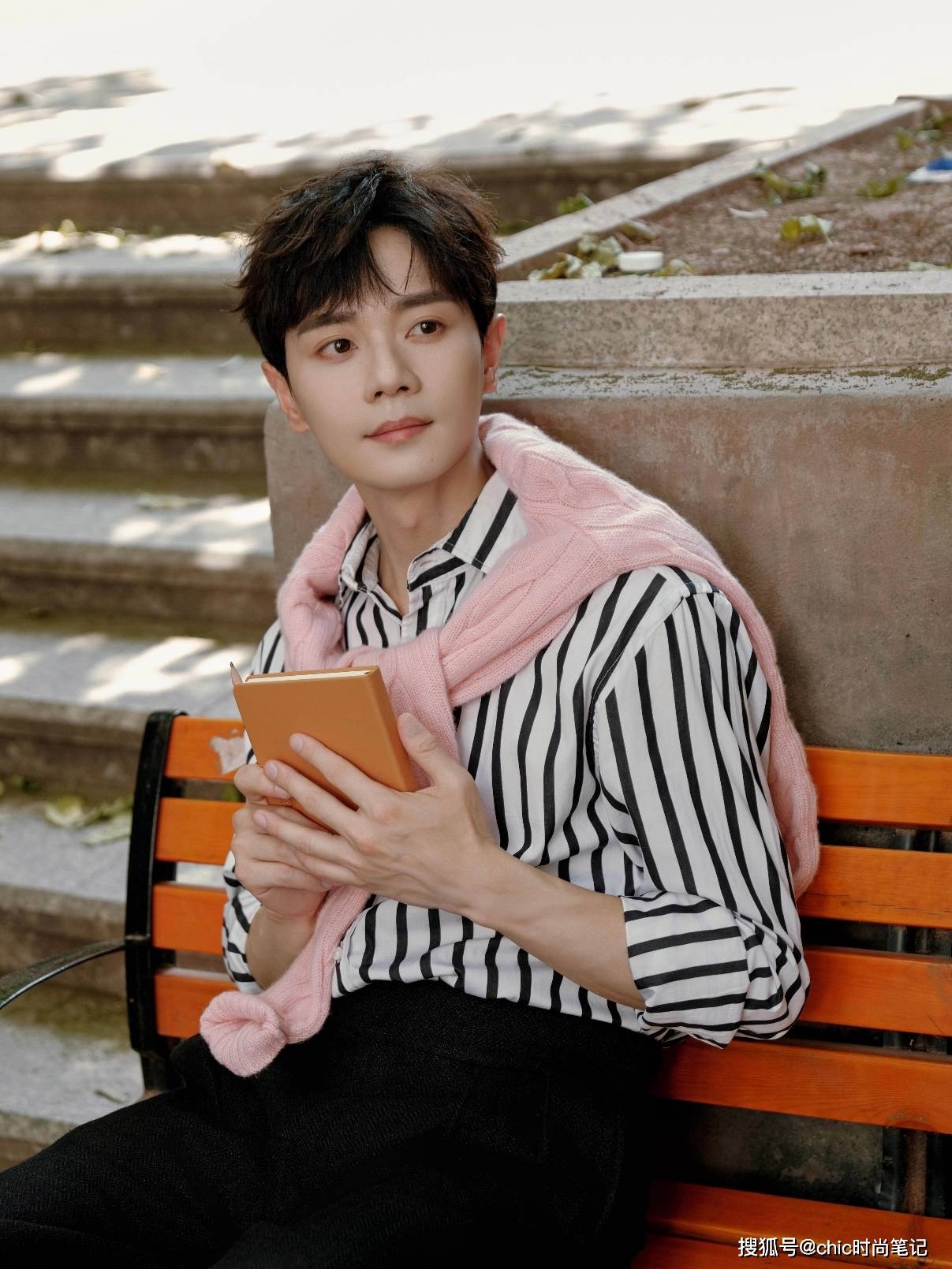 黑白竖条纹衬衫带着男生独有的清爽感,搭配一件带有春天气息的浅粉色针织披肩,披肩与衬衫的搭配清新又松弛,撕漫男即视感。