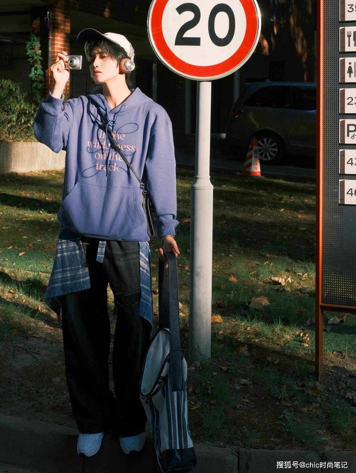 卫衣『穿搭』虽迟但到!宽松大版的连帽卫衣减龄效果满满,搭配深色工装裤,把格子衬衫作为配饰围在腰间,打造『穿搭』的层次与细节。配饰选择鸭舌帽🧢、耳机、帆布包等,文艺男青年『穿搭』get。