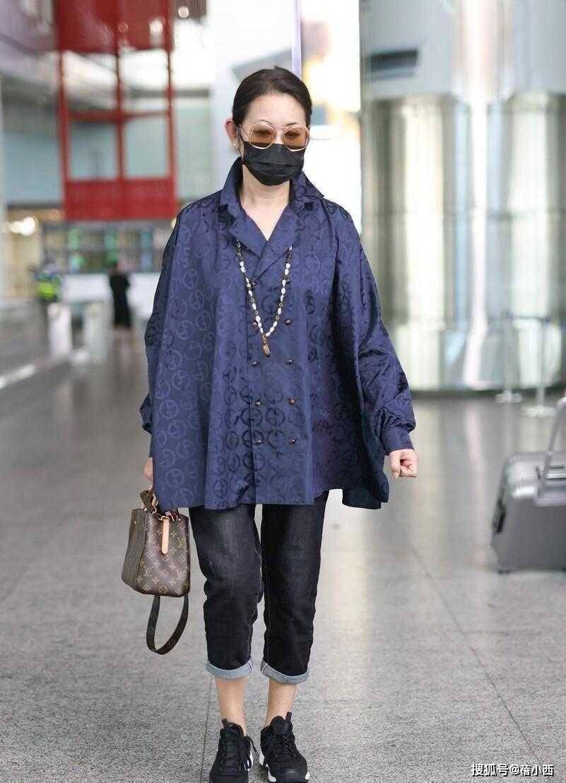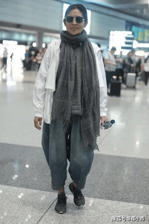 最点睛的当属那条灰色格纹围巾🧣,超长的版型随意绕在脖颈间,垂坠感极强,平衡了下装飞鼠裤的宽松轮廓,更在视觉上拉长了身形比例。下装依旧是她钟爱的牛仔飞鼠裤,做旧的水洗面料自带复古感,宽松的裤腿包容度满分,完美遮掩了中年人的腿部线条问题,再脚踩一双黑色『运动鞋』,轻便舒适又百搭。