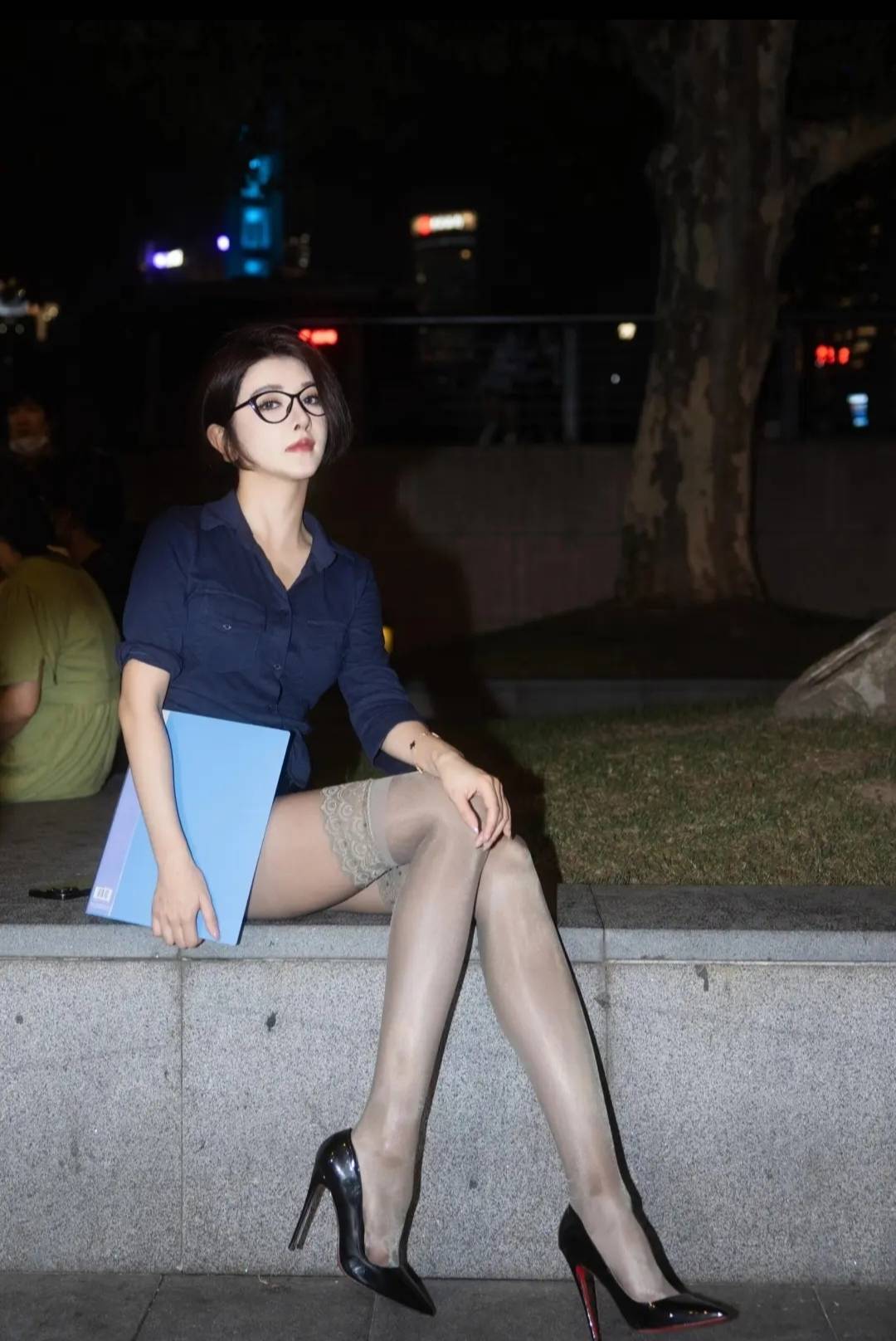 她穿着一件深蓝色的衬衫,那颜色深邃得就像夜空,神秘又迷人,可又带着一份温婉的雅致,就像夜空中偶尔闪烁的温柔星光。这衬衫的剪裁那叫一个合体,既不会紧紧地勒在身上,让人觉得不舒服,又能恰到好处地展现出她身形的曼妙,还透着一股端庄大方的劲儿,仿佛在不经意间就把优雅给展现出来了。搭配这件衬衫的,是一条浅色的短裙。这短裙轻盈飘逸得就像晨曦中第一缕阳光,软软地、轻轻地拂过人的心田,给她的整体装扮添上了一抹清新又灵动的色彩。裙摆随着微风轻轻摇曳,就像是在悄悄地低语,诉说着关于夜晚的浪漫故事,让人听着都觉得心里甜滋滋的。