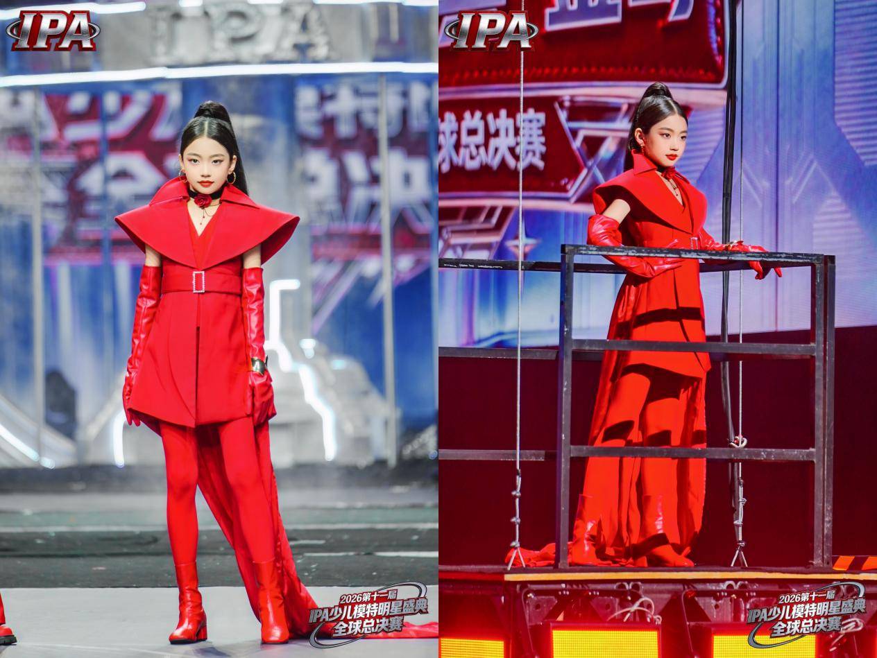 在「红色风暴」双人赛中,田子昕(金姐)与搭档金哥身着同系列红色战袍登场,利落的剪裁、夸张的肩线搭配同色系长靴与手套🧤,造型极具视觉冲击力,二人步伐默契、眼神坚定,以飒爽的舞台表现展现出少年模特的无限潜力与团队协作的强大力量,将现场氛围推向高潮。