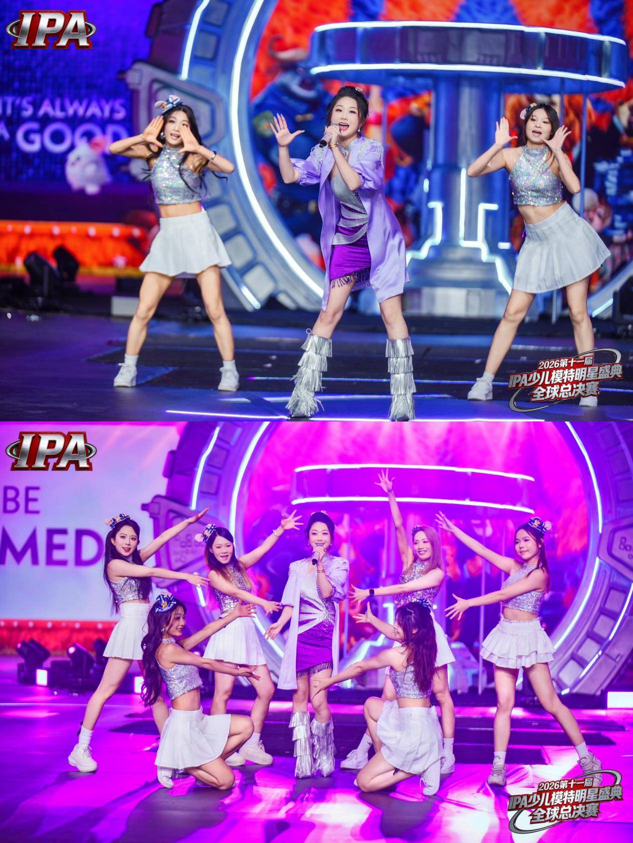 当灯光切换为未来感赛博紫,张宸溪迎来个人才艺绽放时刻。她以浅紫色宽松外套🧥搭配亮面紫色流苏短裙,脚踩银色流苏长靴,造型潮酷契合星际主题。伴随动感乐曲《ZOO》,她以精准卡点的舞蹈动作、极具穿透力的歌声,与伴舞默契配合,全程从容专业、活力四射,将舞台魅力与艺术表现力展现得淋漓尽致,为全场小超模树立榜样,传递“美育舞台无边界”的理念。