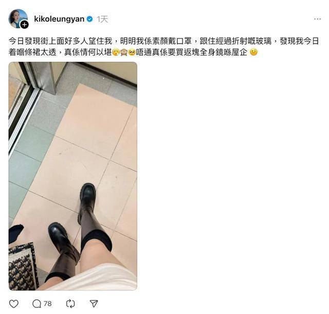 根据梁茵在『社交媒体』上发布的图文,她当时正在香港街头行走。照片中,她声称素颜出行并戴着口罩,但『穿搭』却极为惹眼:上身是一件浅色超短连身裙,下搭黑色长靴。她在文字里大吐苦水,描述自己走光的过程,称当天敏锐地察觉到周围路人的异样目光。起初她满头疑惑,直到路过一面玻璃墙,透过折射才猛然发现,自己浅色裙子👗在烈日照射下几乎完全透明,内里若隐若现的春光暴露无遗。面对如此尴尬的情景,梁茵无奈感叹情何以堪,甚至调侃道:难道出门前真的要先买块全身镜吗?