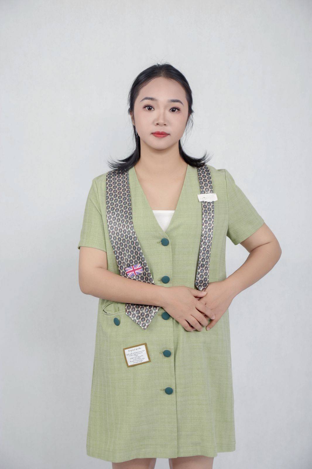 休闲学院风:绿色 V 领裙搭配复古领带👔的造型,她将学院风的随性与都市感的干练平衡得恰到好处,宽松的裙型没有掩盖她的曲线优势,反而通过姿态调整,展现出慵懒又利落的气质,适配日常通勤、校园等多种场景。