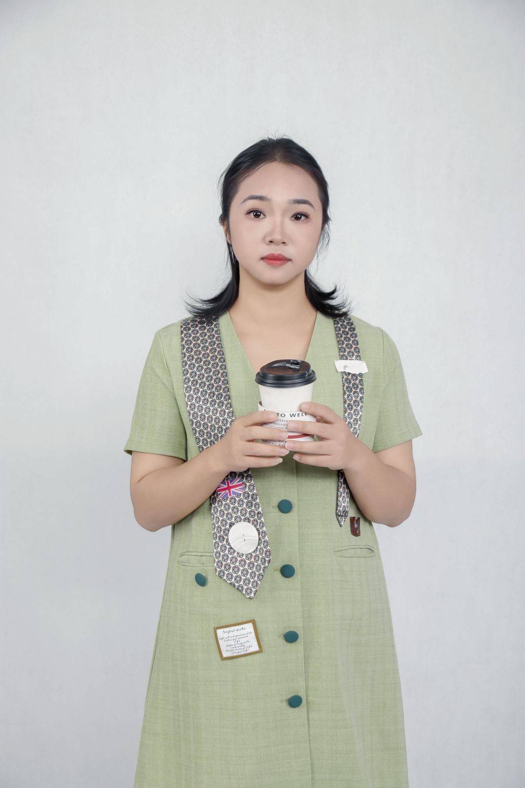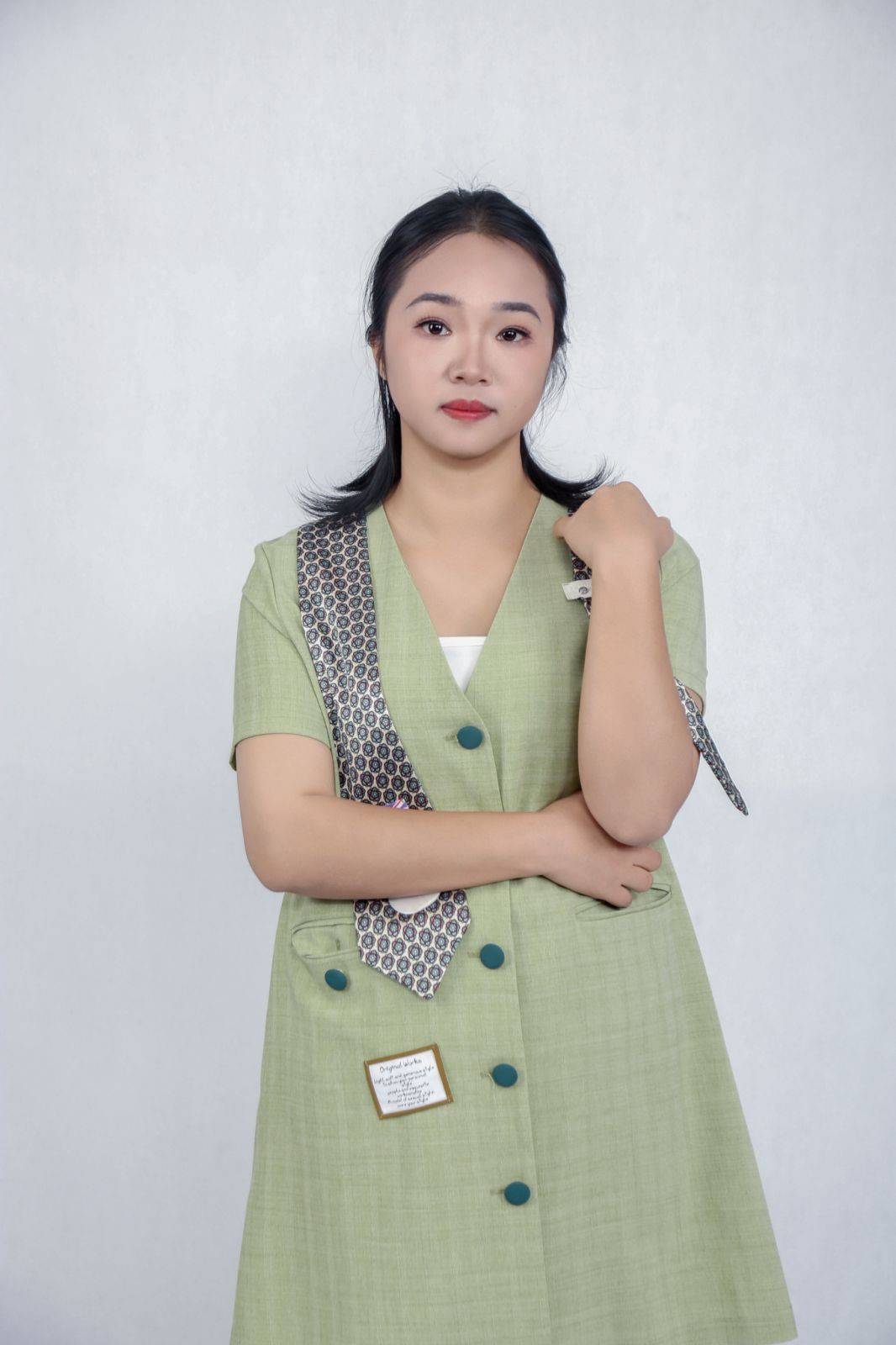 在绿色休闲裙的系列拍摄里,她的镜头感更显多元:交叉双臂时的沉稳大气,双手捧杯时的温柔亲和,侧身回眸时的灵动俏皮,每一个姿态都精准踩中服装的风格调性,却又带着个人的独特印记。她懂得用身体语言与镜头对话,让每一张照片都成为 “有故事的瞬间”—— 不是为了摆拍而摆拍,而是为了表达而存在。