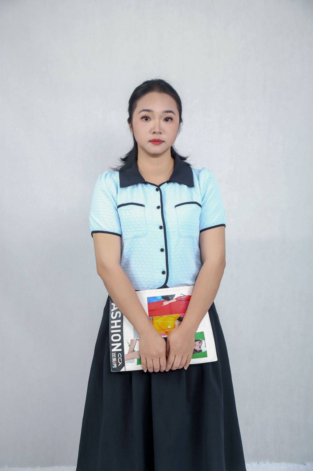 文艺清新风:浅蓝色衬衫搭配黑色长裙👗的造型,她化身文艺少女,简洁的配色凸显出干净通透的气质,手持杂志时的沉静,交叉手臂时的温柔,完美适配文艺、日系等清新风格,传递出 “岁月静好” 的氛围感。