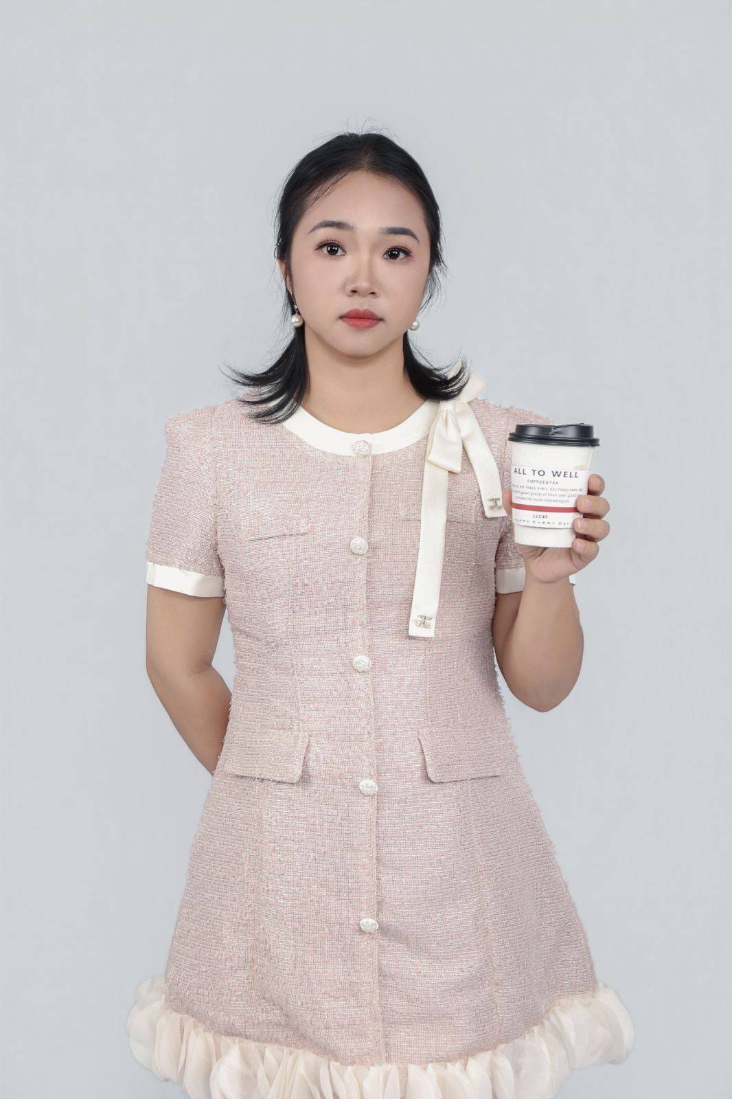在粉色小香风裙的拍摄中,她时而单手托腮,眼神温柔而灵动,将少女的娇俏与精致完美融合;时而双手抱臂,目光坚定而从容,展现出职场女性♀️的干练与自信。哪怕是手持咖啡杯的简单道具,她也能通过指尖的力度、眼神的方向,传递出 “都市日常” 的松弛感,让静态的照片充满生活的烟火气。