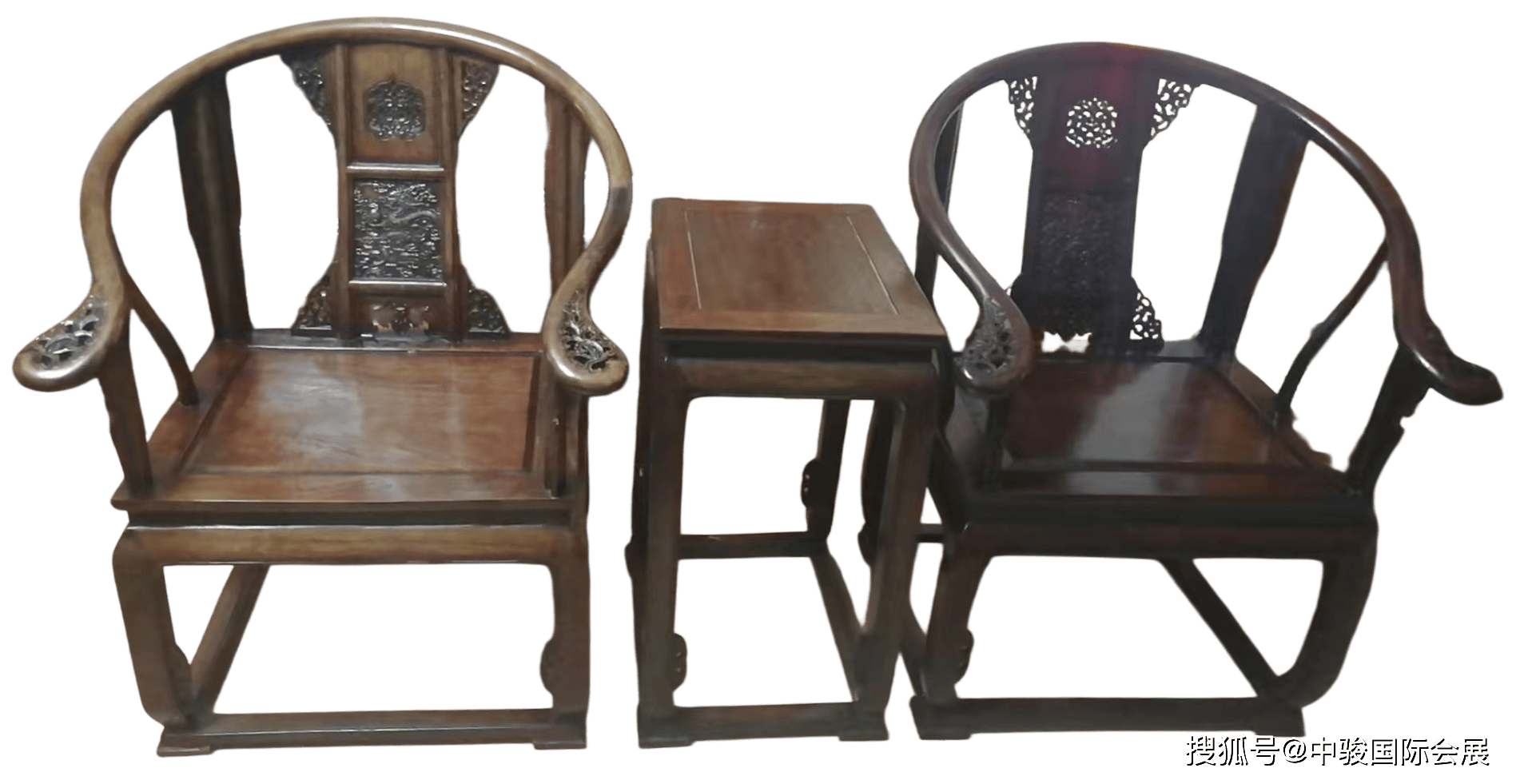 在结构工艺上,全器采用传统榫卯结构拼接,无钉无胶却严丝合缝、稳固耐用,体现了中式家具 “材美工巧” 的核心追求。椅腿为鼓腿彭牙式,末端连接托泥,既增强了整体稳定性,又蕴含龙龟托载的祥瑞寓意;扶手端头外撇,形似张开的双臂,传递出虚怀若谷的气度,与中间茶几的方正几面形成呼应,视觉上和谐统一。装饰细节上,靠背板采用三段式攒框结构,上截透雕卷草纹或龙纹,线条纤巧灵动,既保证了透气性,又彰显皇家威仪;中截多镶瘿木或光素面板,凸显材质本身的纹理之美;下截亮脚常作云纹或蝙蝠形,寓意吉祥如意。扶手与椅圈、座面相交处,以大面积镂空角牙装饰,既弱化了构件衔接的生硬感,又强化了正面视觉层次,雕工繁复却不显累赘,尽显清代宫廷家具 “精雕细琢、雍容华贵” 的风格特征。