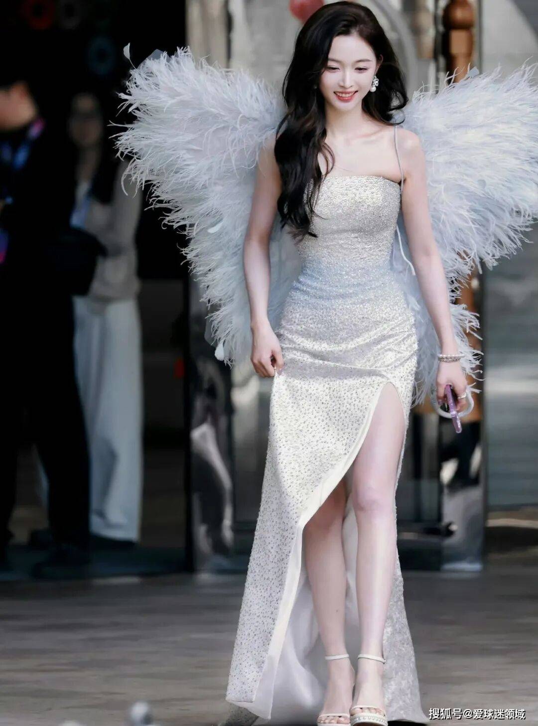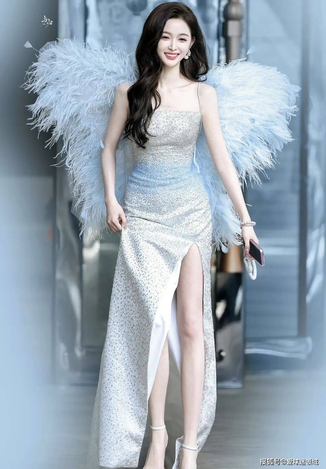 当她转身时,翅膀随着动作轻轻颤动,羽毛飘摇,真的像天使降临人间。浅蓝的色调和银白礼服形成柔和的色彩呼应,白色和蓝色本来就很搭,这里的浅蓝又很清淡,不会抢了闪钻的光芒,反而让整体视觉效果更加丰富。如果没有这对翅膀,这套造型可能只是众多闪钻礼服中的一套;有了这对翅膀,她站在那里就有了故事感,像是某个奇幻故事里走出来的角色。