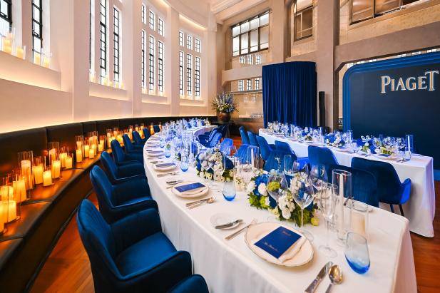 伯爵蓝与鎏金光华交织,在装饰艺术风格的优雅空间内,模特佩戴高级珠宝翩然演绎,小提琴二重奏悠扬奏响,为这场鎏金夜宴铺陈浪漫序章。晚宴现场陈列PIAGET伯爵Polo 79系列、安迪·沃霍尔系列以及Limelight Gala系列等多枚经典时计臻作,致敬品牌152周年辉煌传承。