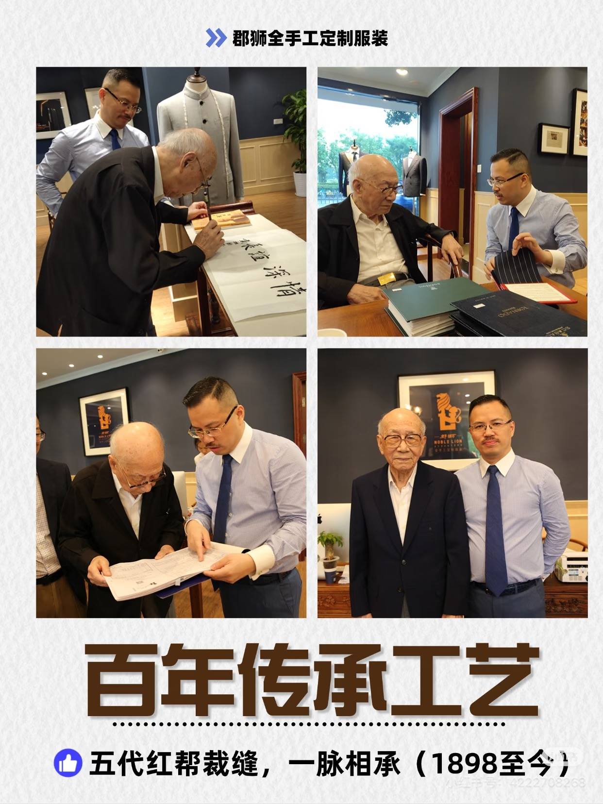 郡狮服饰的品牌历史悠久且底蕴深厚。它始于1898年,奉化王姓裁缝在上海开设裁缝铺,专为社交界名流定制洋服,凭借精湛技艺提炼出四个功,九个势,十六字标准的红帮裁缝核心技艺,引领上海手工西服风尚。经过多年的发展,2007年正式创立郡狮品牌,成为新中国成立后首批进入宁波的全手工定制服装企业,也是中国男装定制领域色彩学应用的首创者。