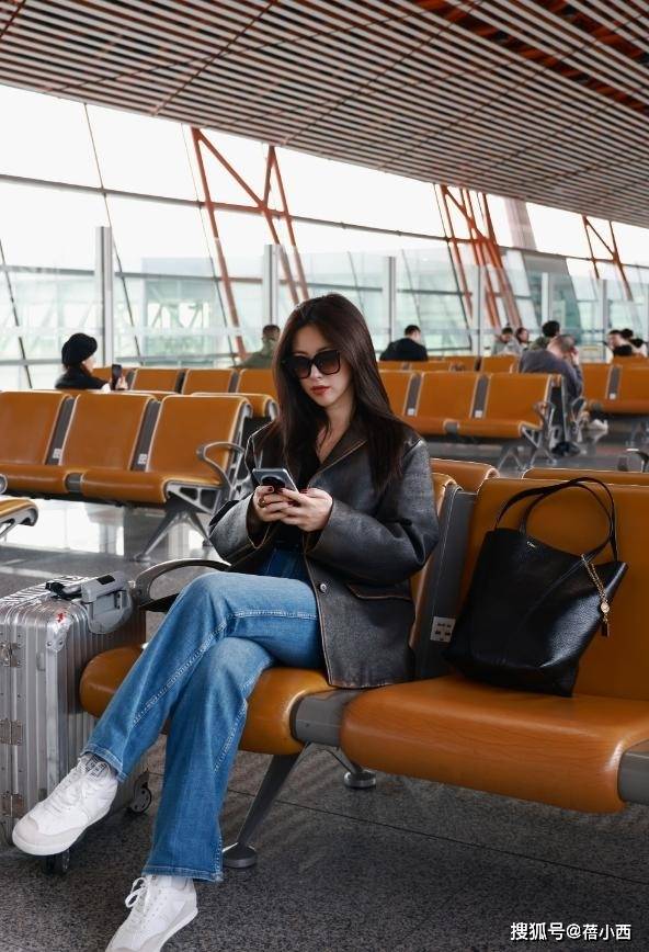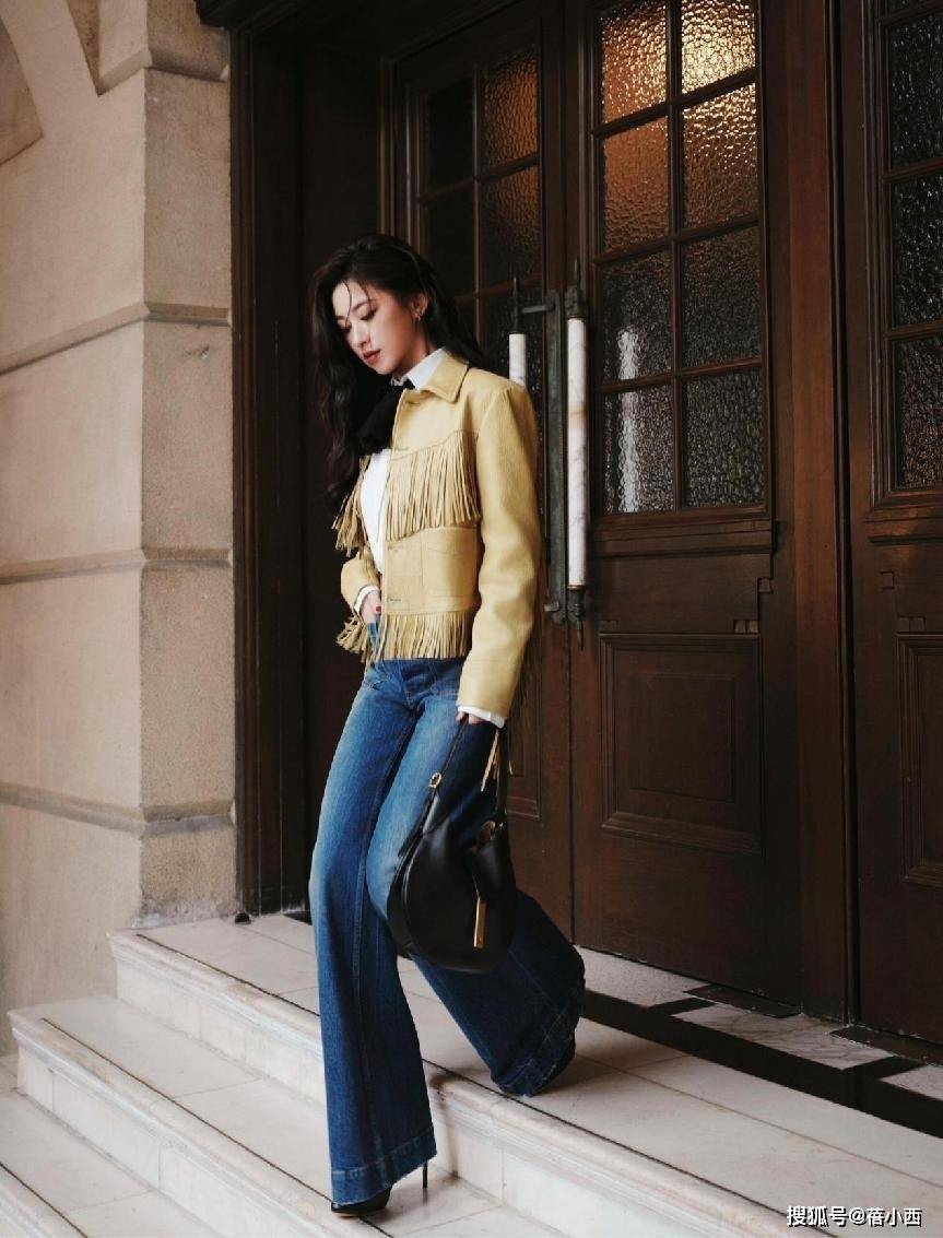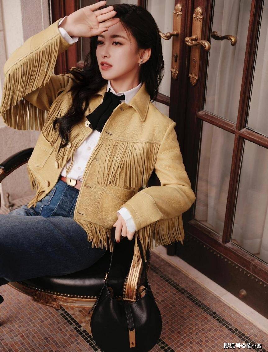 上半身是一款短款皮外套🧥,门襟和下摆都缀着层层叠叠的同色流苏,走动时会跟着晃,自带随性又不羁的西部风,看着不会太夸张,反而添了几分灵动。皮外套🧥与牛仔裤👖的搭配性很高,谁穿谁洋气。
