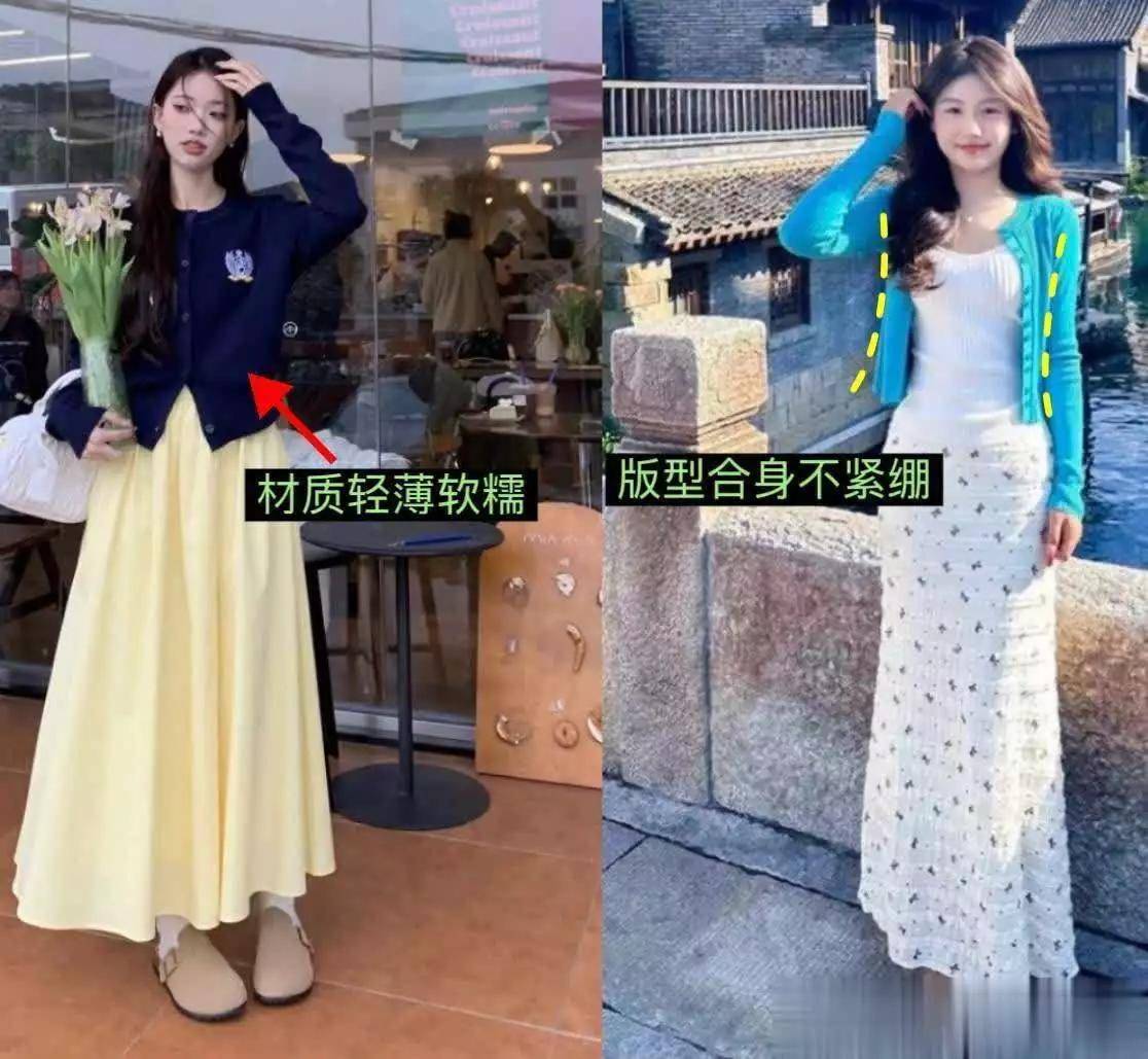 **挑选『针织开衫』,面料首选轻薄有筋骨的羊毛、针织棉、莫代尔,透气软糯不扎人。版型要合身不紧绷,小个子选短款拉高比例,窄肩选微落肩设计,牢记“微宽松>紧身>松垮”。**