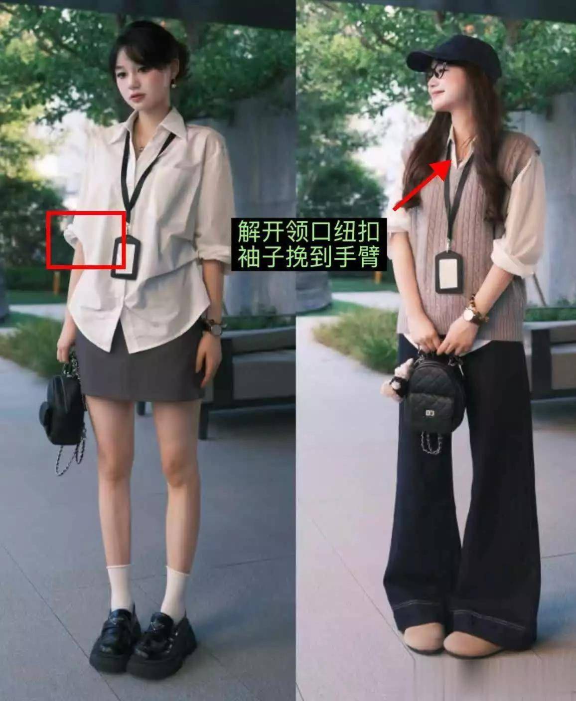 『穿搭』不要局限,学会解锁技巧,同一件单品不同穿法效果不同。衬衫想要更时尚,可解开两颗纽扣,挽起袖子到小臂,玩转休闲范,还可尝试叠穿马甲、西装、吊带等。