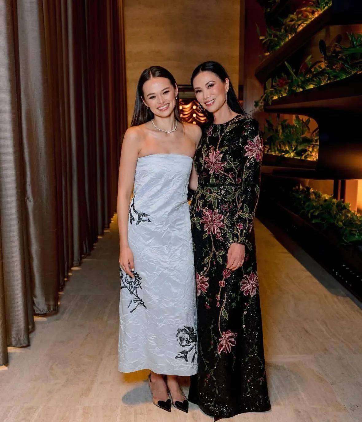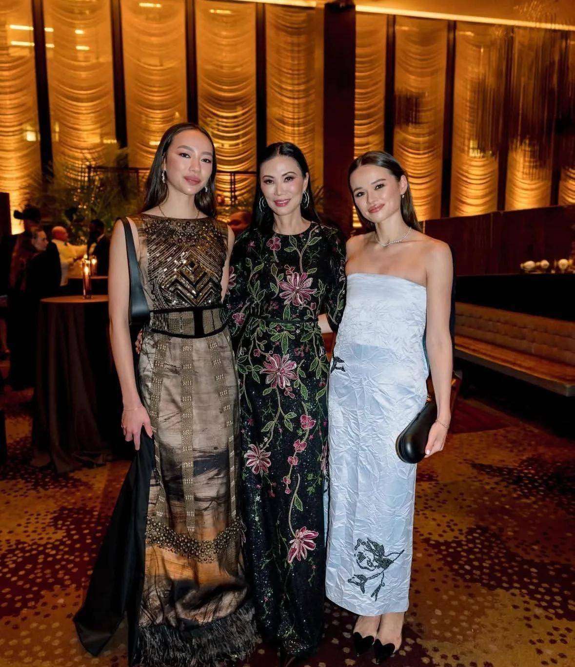 克洛伊选择一袭香槟金复古斜裁长裙👗,裙身镶嵌数千颗施华洛世奇水晶,在灯光下熠熠生辉。相较姐姐的柔美,她举手投足间更具现代都市女性♀️的飒爽气场。当邓文迪一手轻挽格雷斯、一手紧握克洛伊,三人并肩而立时,那份源自血脉与信任的骄傲,已无需言语诠释。