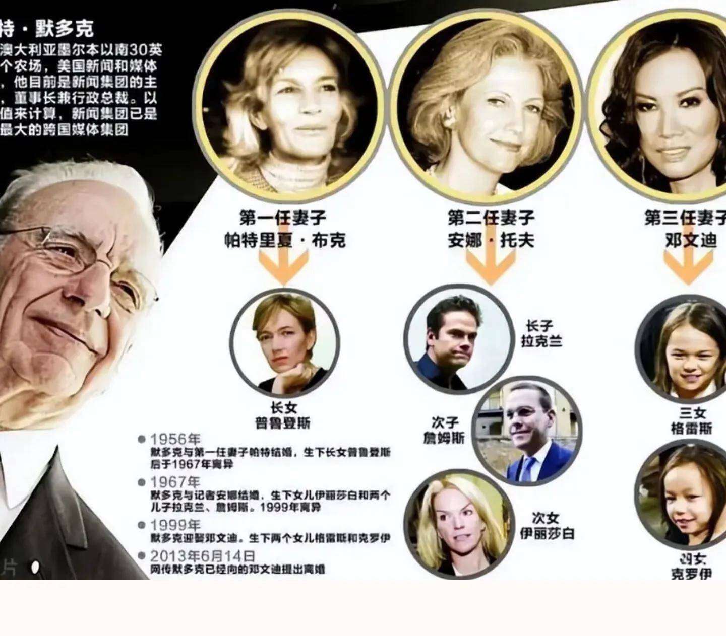 这场家宴的核心,始终围绕默多克庞大的家族图谱展开。他育有六位子女:与首任夫人帕特里夏育有长女普鲁登斯;与第二任妻子安娜共同抚养三名子女——长女伊丽莎白、长子拉克兰以及次子詹姆斯;与第三任夫人邓文迪诞下格雷斯与克洛伊两位千金。每位子女的成长轨迹与身份认同,在这场寿宴中都悄然折射出来,像一面镜子映照出家族的复杂关系与情感脉络。
