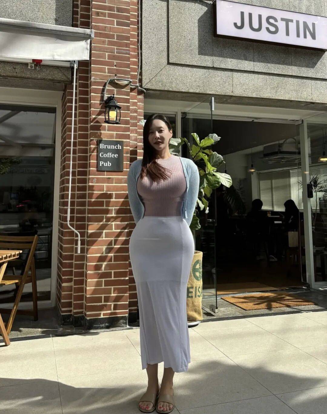 她在咖啡店里坐着,端起杯子抿一口,然后看着窗外发呆。阳光从侧面照进来,在她脸上落成一片柔和的光。那个画面,安静得像一幅画,却又生动得像在讲故事。