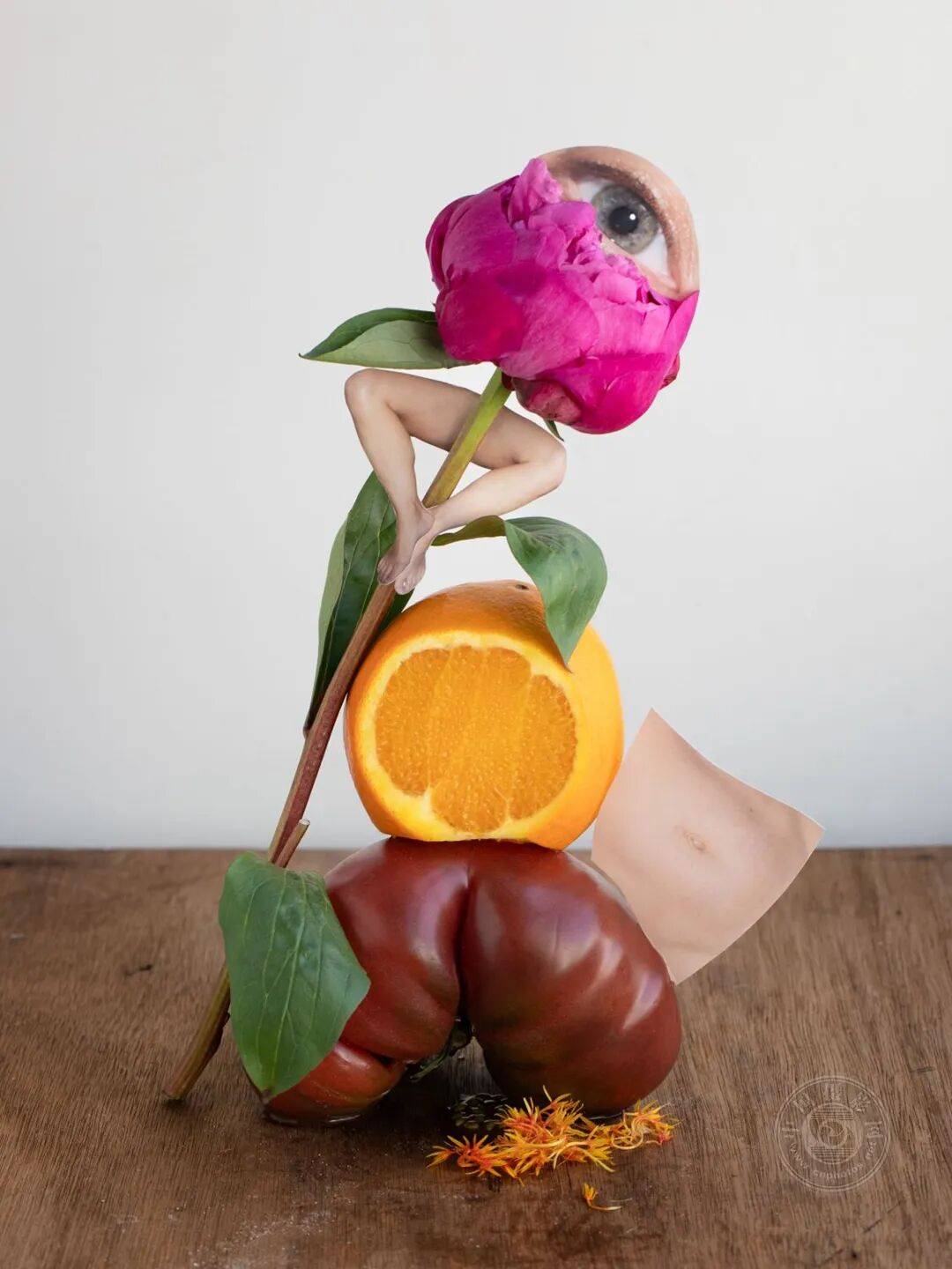 我以静物画的传统形式为载体,依据自身诗意逻辑重组身体碎片。将有机物(水果、蔬菜、奶酪、石块)与其他物件作为象征性替代物融入画面,以此提醒世人,身体超越其可见的物质性,它拥有想象的、能量的、形而上的维度,绝非表面现象所能涵盖。这件作品由此成为抵抗的空间,亦是通过创造性表达重获身体能动性的途径。