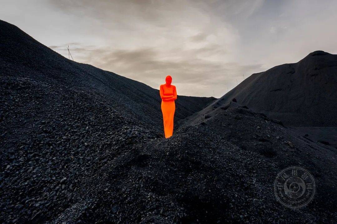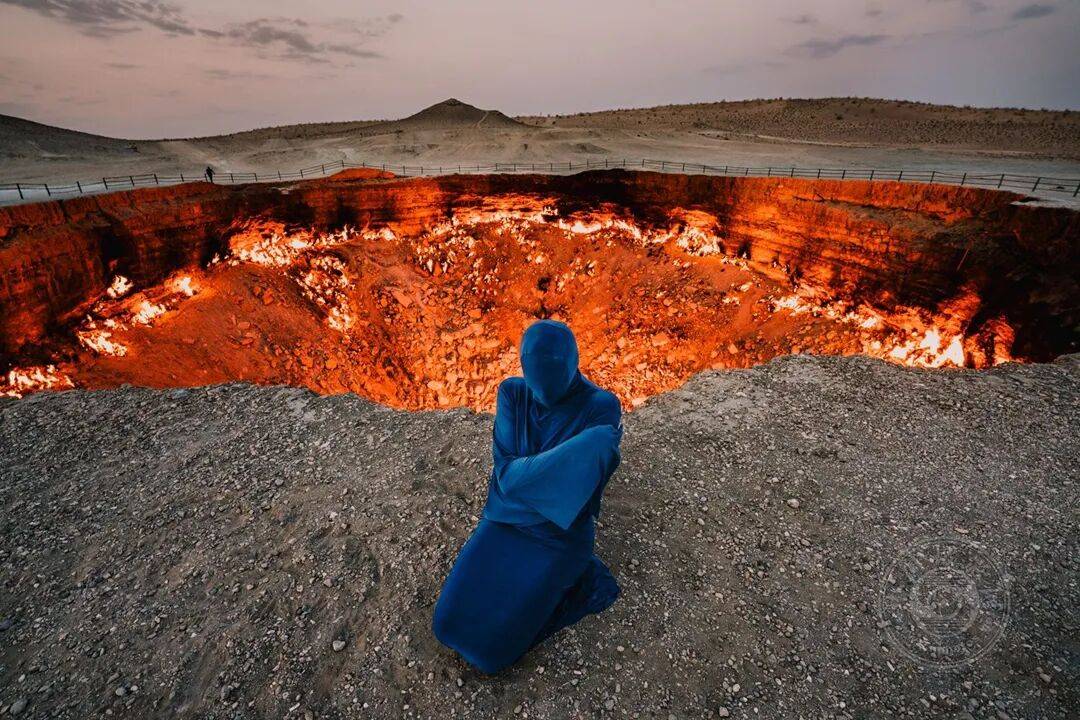 我的创作核心在于以女性♀️视角捕捉崇高之美。我身着自制布艺服饰,在采掘业环境中拍摄自画像,将身体转化为具有女性♀️符号的物体。《达瓦扎圣殇》便是在卡拉库姆沙漠的达瓦扎天然火山口(又称地狱之门)拍摄完成。我与助手驾驶四驱越野车深入沙漠数百公里,穿越无人区抵达此地。这个燃烧逾五十载的火坑持续着碳排放。1971年苏联『工程师』在此钻探天然气井时井壁坍塌,为防止有毒气体泄漏,他们点燃了火坑。科学家预测火山口内的火焰将持续燃烧数十年。这座“圣殇”雕像令人联想到历史画作中哀悼的圣母玛利亚,其名称源自意大利语中“慈悲”与“怜悯”之意。