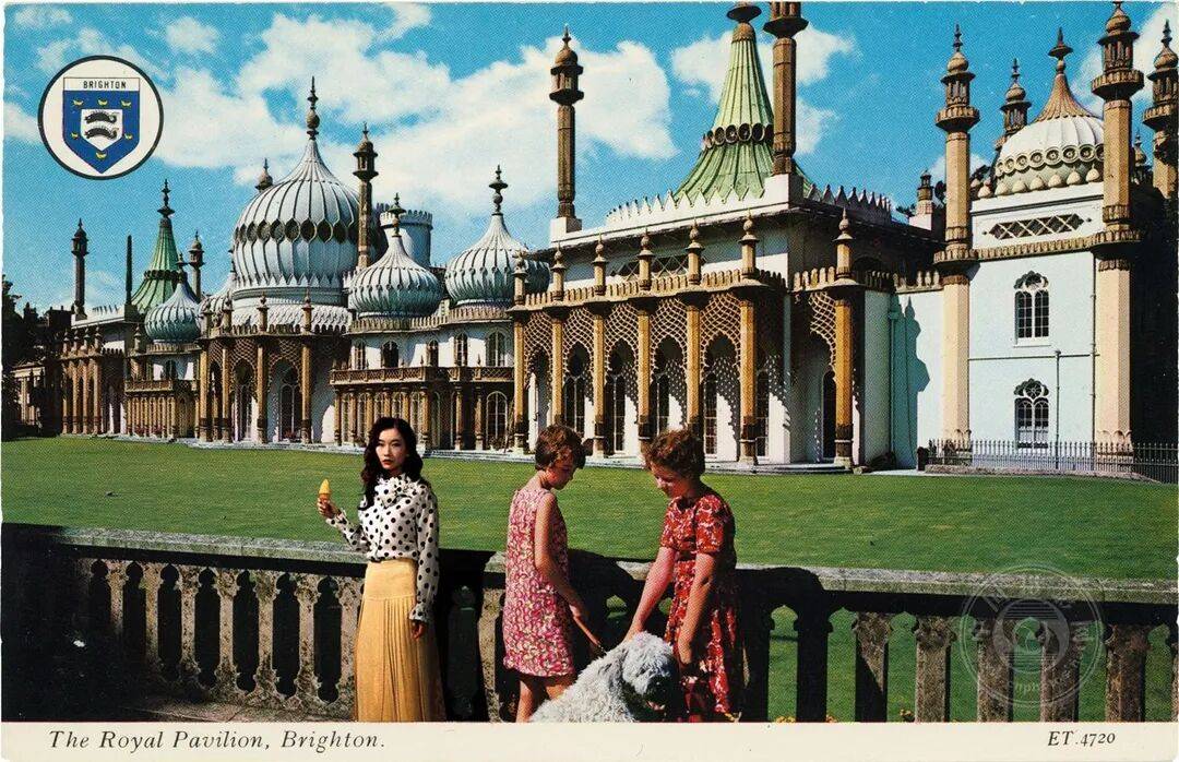 这幅图像是一张经过数字处理的布莱顿皇家亭园复古明信片,将历史呈现与当代存在并置。原版明信片以鲜艳色彩和理想化的亭园描绘,折射出二十世纪中叶将建筑塑造成异域地标的旅游美学。艺术家将自己置入这幅精心构图的场景,既与画面浑然天成地融合,又微妙地打破了其完整性。