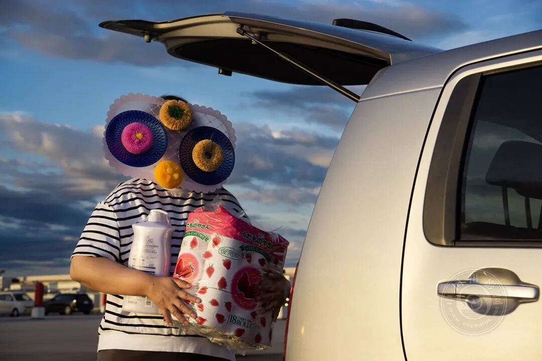 这件作品《购物》出自艺术家山本久代的自画像系列《像女人一样》,她借此表达对“女性♀️气质”的抗拒。该系列自画像展现了她对传统“女性♀️气质”观念的不适感。在该系列中,她戴着自制的面具拍摄自己从事家务劳动的场景。这些面具取材于与食物相关的物品(象征女性♀️的养育角色)以及关联社会文化中女性♀️气质观念的时尚或美容产品。