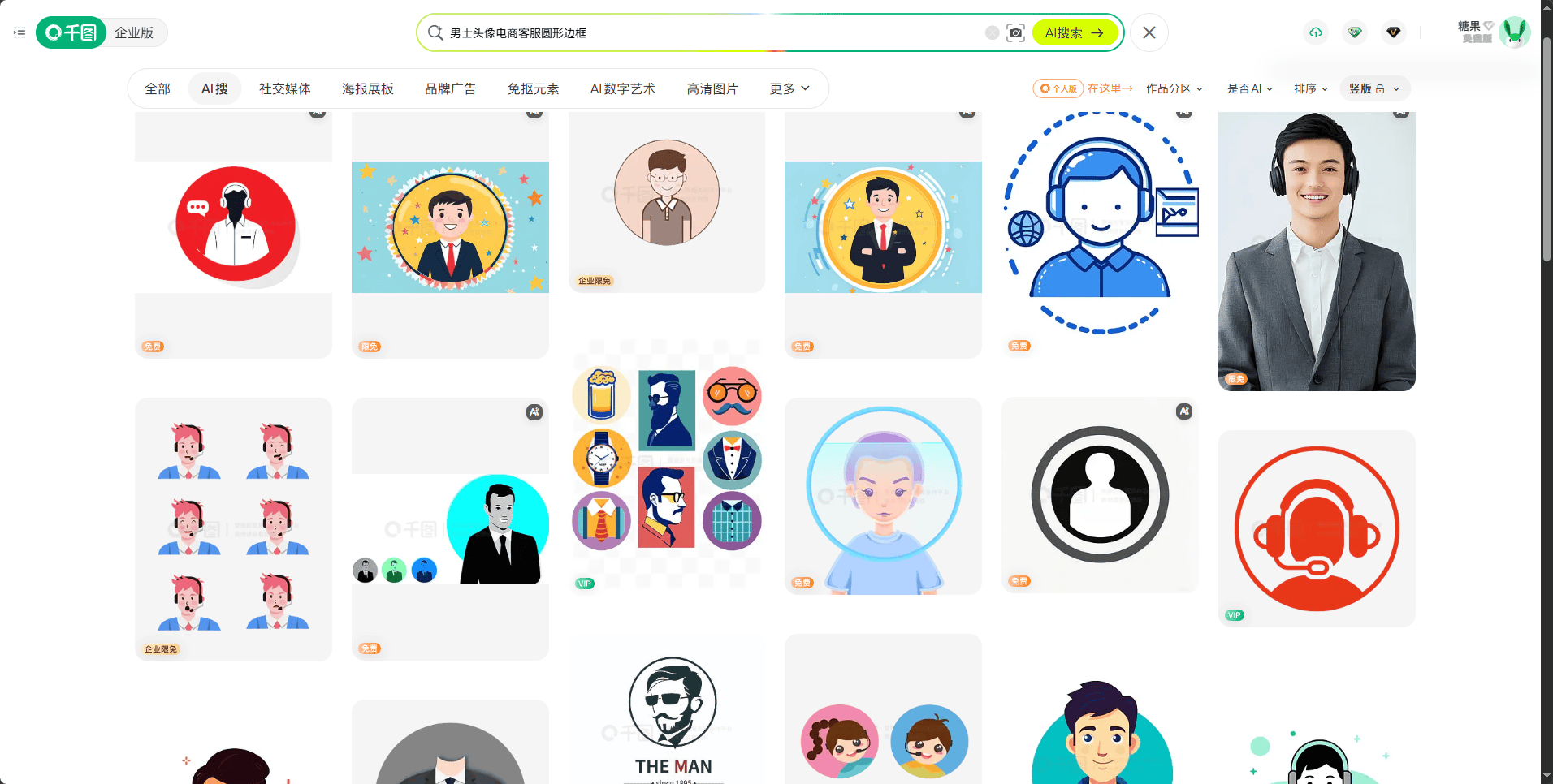 1. 在千图网搜索。输入「男士头像 电商 客服 圆形 边框」,筛选文件类型同样选 PSD/AI,颜色选择对比强的配色(蓝/白或黑/黄)。