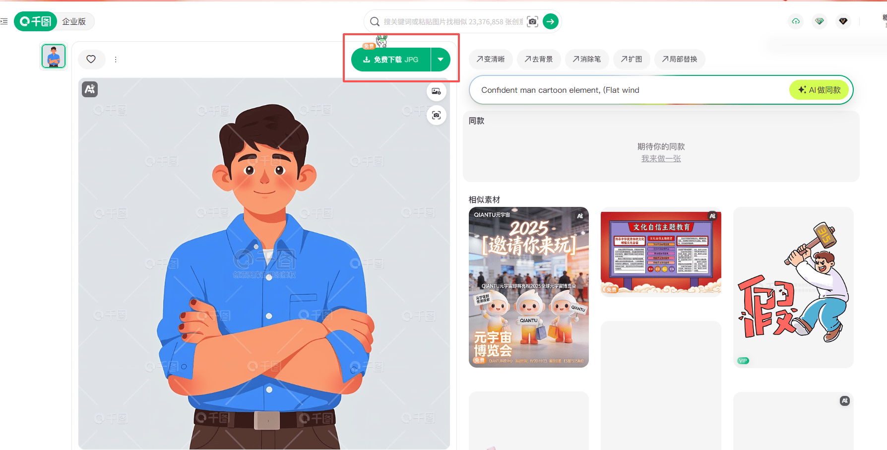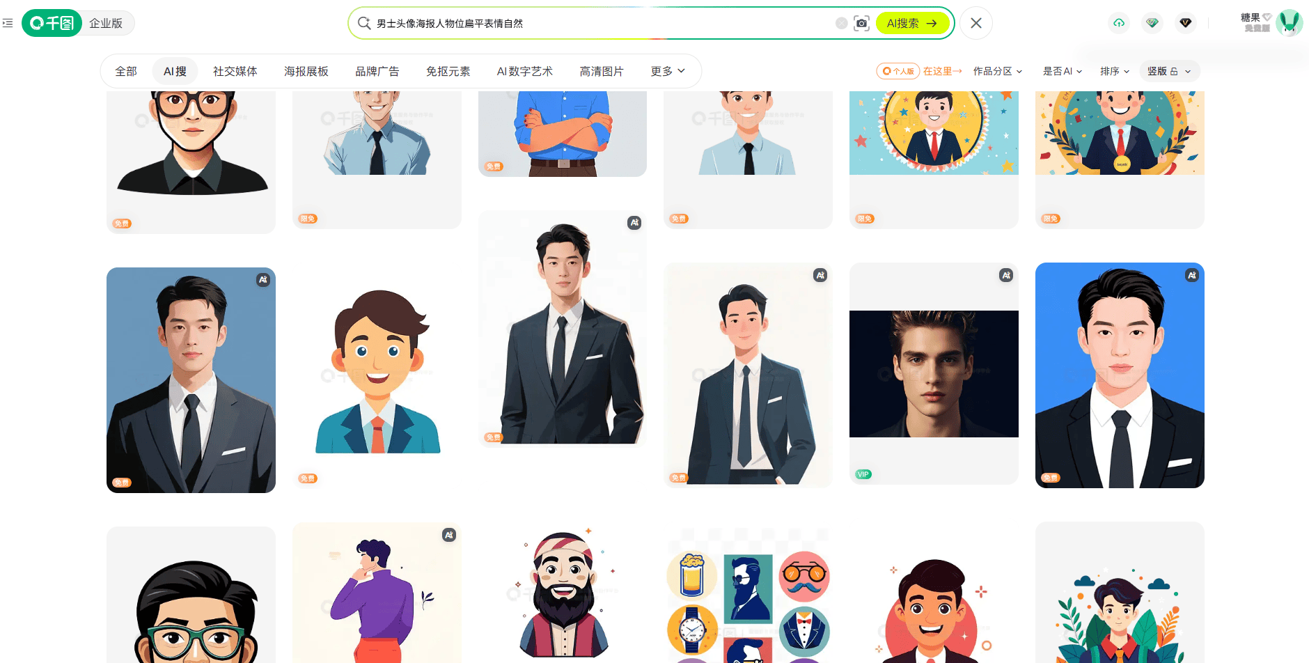 1. 在千图网搜索。输入「男士头像 海报 人物位 扁平 表情自然」,筛选风格为插画,题材为职场或生活场景。
