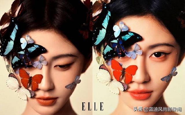 另一帧里,斑斓彩蝶覆面,只留一双含情眼眸直面镜头,把东方审美里 “犹抱琵琶半遮面” 的含蓄与张力拉到极致,不用完整的『妆容』展示,反而用意象留白,给了画面无限的想象空间,也彻底打破了 “『鞠婧祎』离不开半永久『妆容』” 的刻板印象。