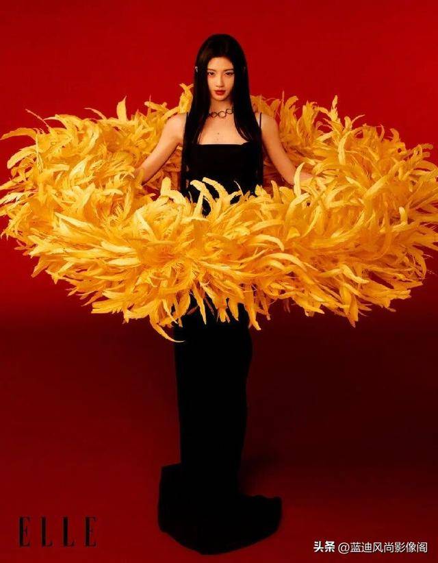 更多造型里,我们看到了她完全不同的美态。浓烈正红背景里,明黄色羽毛环绕周身,她黑裙加身,身姿挺拔,跳出了柔婉的固有框架,展现出极具冲击力的明艳与张扬,是古典审美里 “艳若桃李” 的热烈风骨;