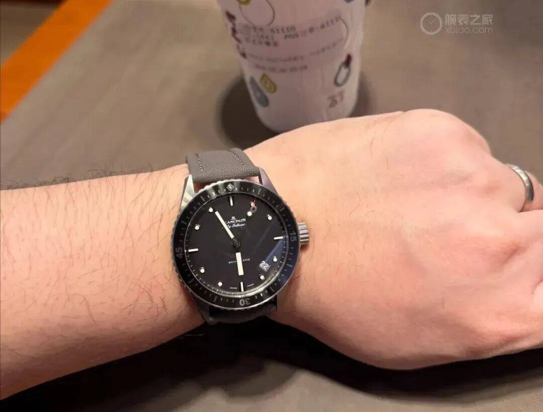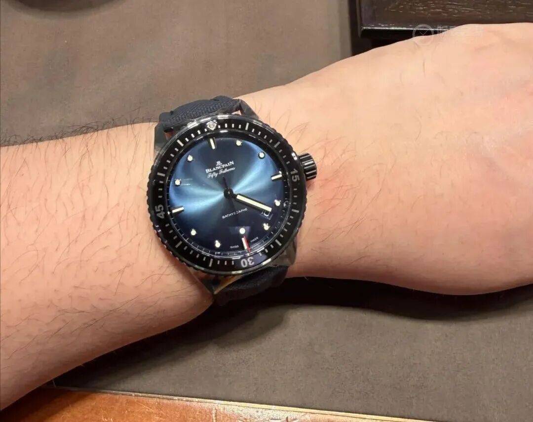 去年女儿出生,忙了半年以后得了点闲,春节突然重新对腕表十分心热(当时原因主要是黑陶瓷『工程师』) ,于是把封存的中华年历也拿出来摆弄了,一直不调历也不是个事,于是乎我去出售的店里调一下历。北京SKP店虽然不是很大,但是表款是非常齐全的,店员也非常热情专业,在调历的时候我也看了看宝珀的表款,当时觉得五十噚样子很不错,于是开始试戴,店里有钢/钛/陶瓷三种材质类型。
