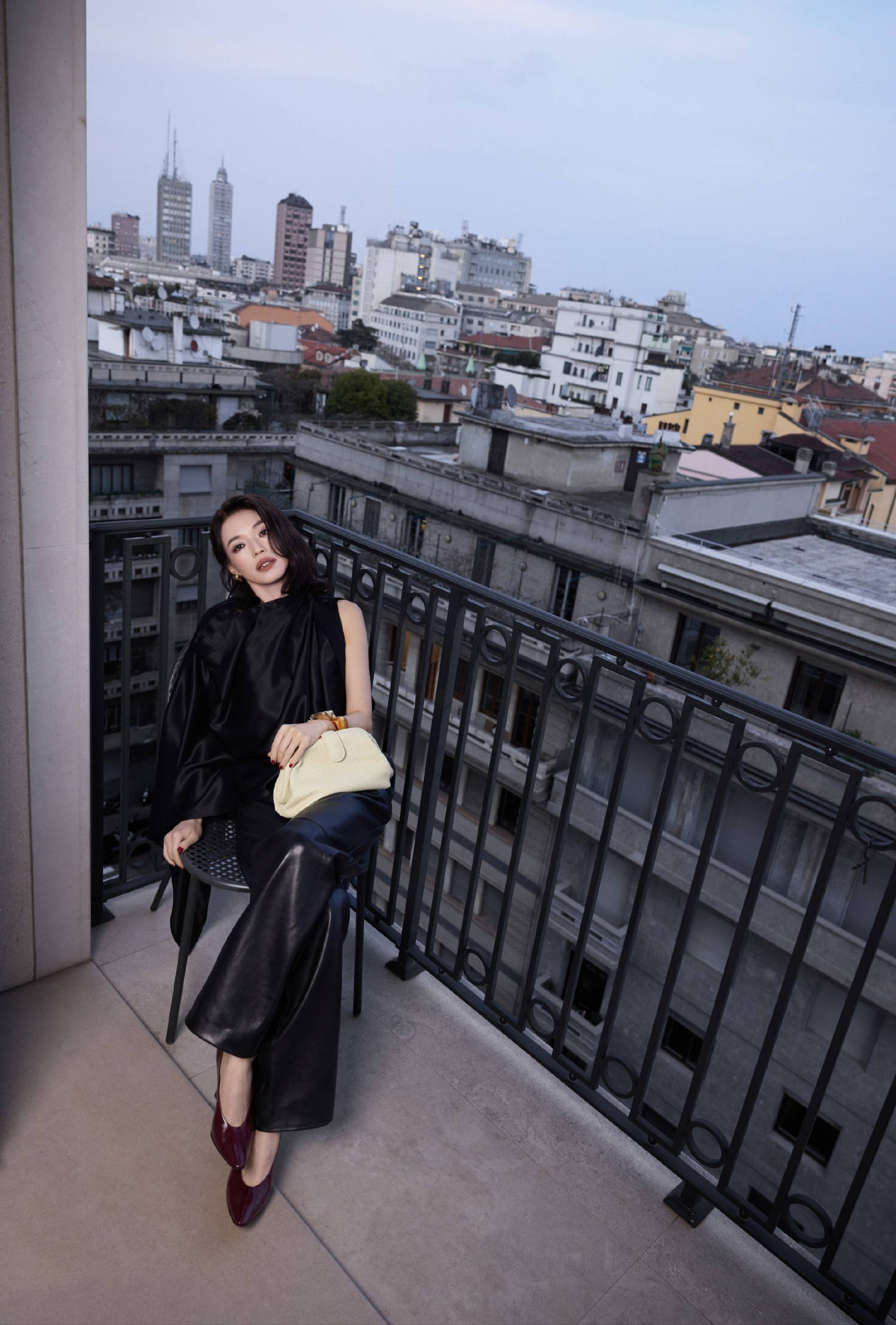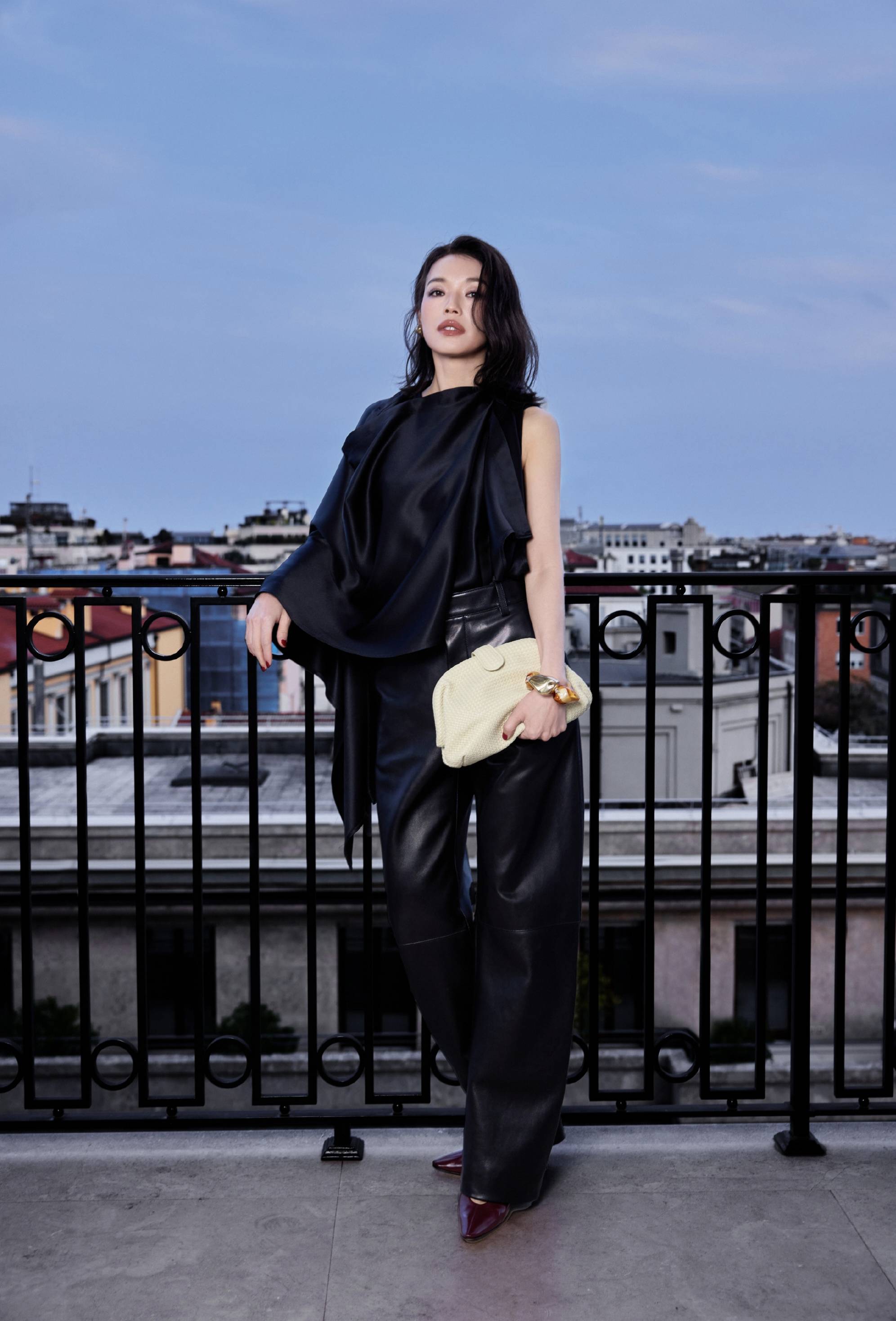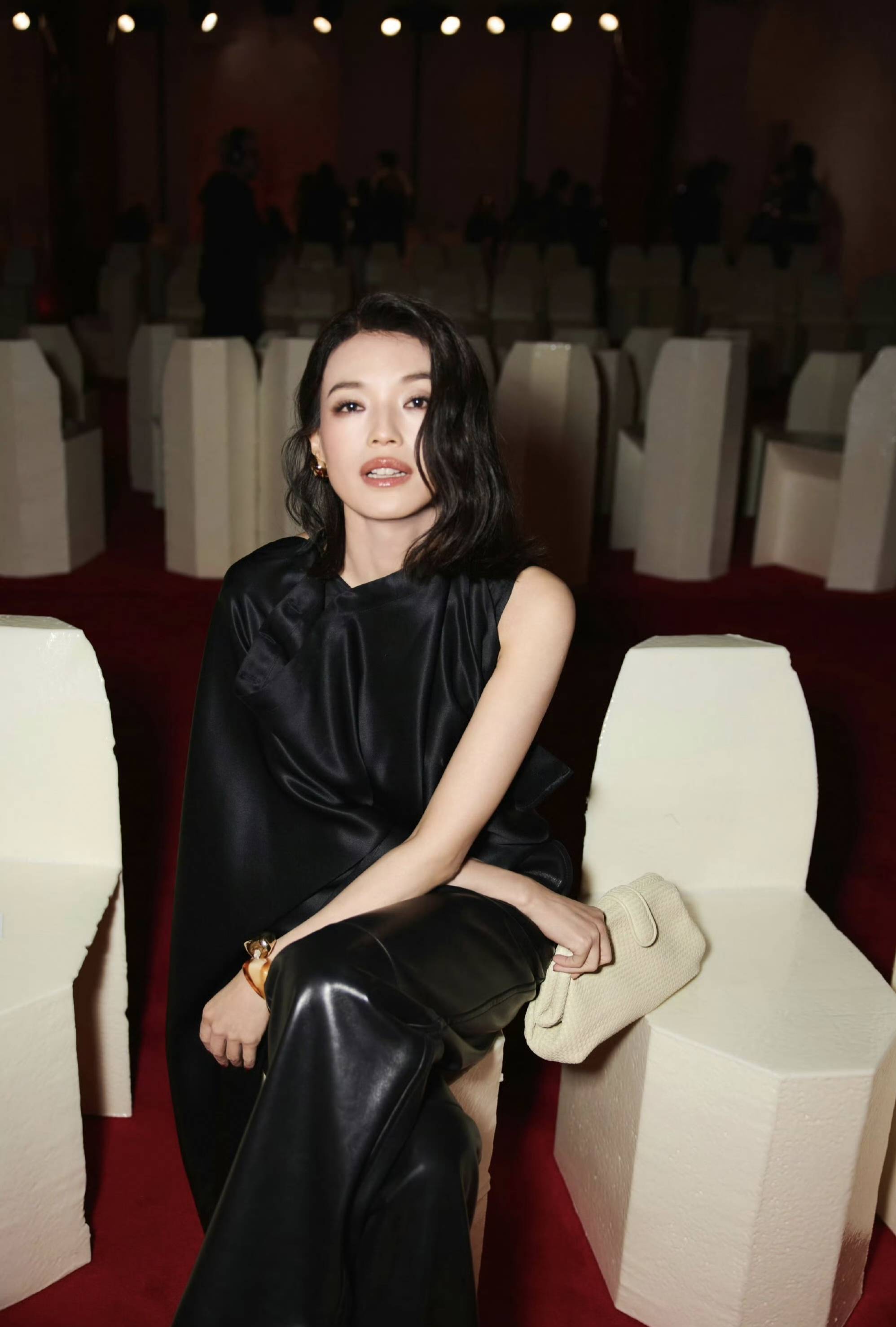 『舒淇』身着品牌专属定制的全黑造型,上身是哑光丝缎质地的露肩上衣,温润的光泽感恰到好处地凸显了锁骨的线条美;下身搭配同色系做旧哑光皮质长裤,冷硬的材质与上衣的柔滑形成了巧妙的“材质对冲”。为了驾驭这套侧面带有镂空设计的造型,她甚至笑言特地早起运动。整套Look仅以一只琥珀色编织手包和酒红色尖头高跟鞋👠点缀,便轻松打破了暗色的沉闷。