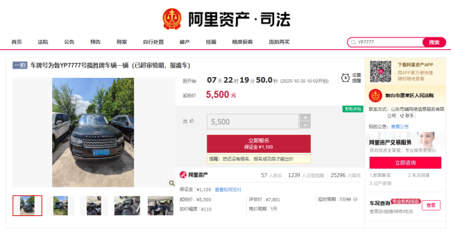 10月22日,现代快报记者注意到,在阿里拍卖平台上,一台车牌号为鲁YP7777的报废路虎越野车,将以5500元的价格挂网拍卖,目前已有57名竞买人报名参拍。值得注意的是,这辆车在今年9月曾以27万余元的价格拍卖成交,后遭遇悔拍,于是有了此次拍卖。