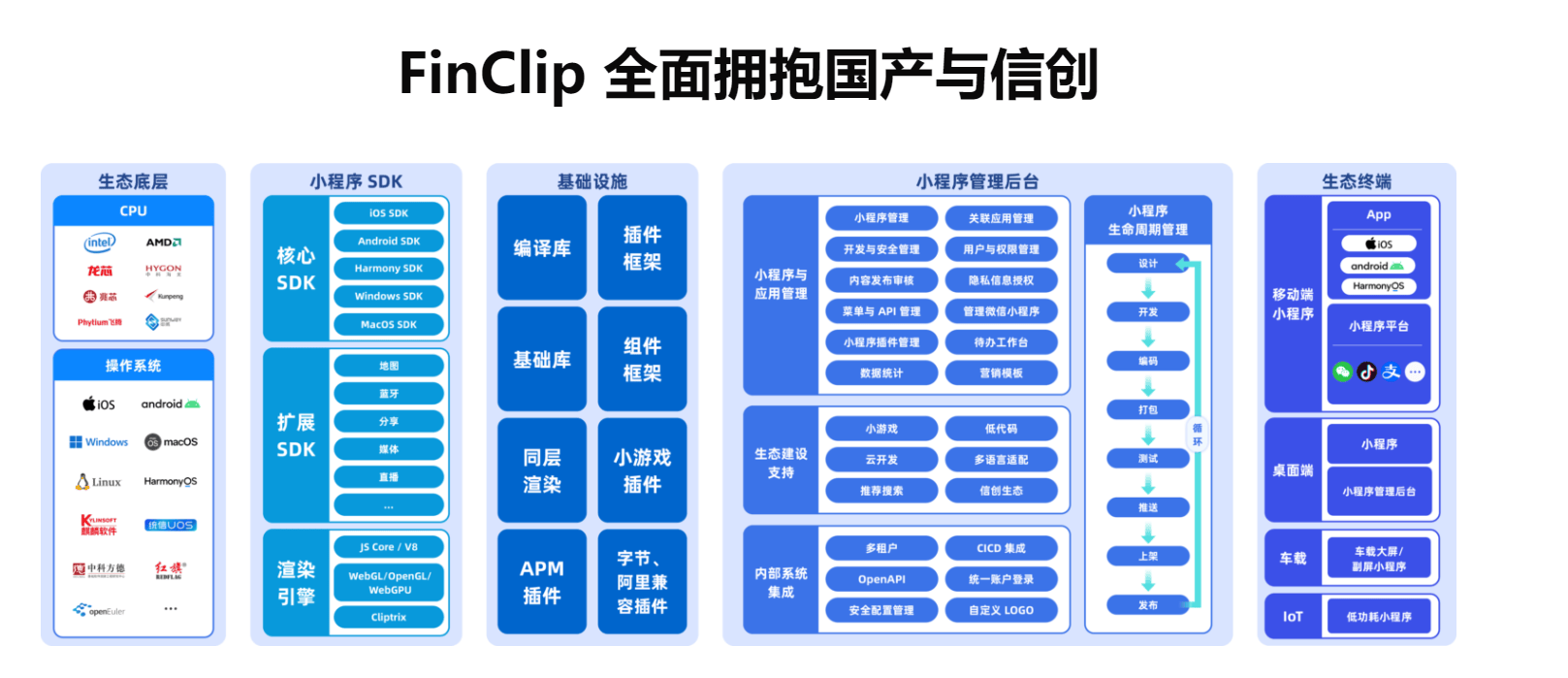 FinClip 已完成国产操作系统(如鸿蒙、统信 UOS、麒麟软件)、数据库的兼容认证,支持国密算法,能满足政企、金融等行业对 “自主可控” 的要求;同时,管理后台提供完整的审核流程、操作日志,企业可追溯每一次小程序的发布、修改记录及 AI 交互数据,便于应对监管审计。